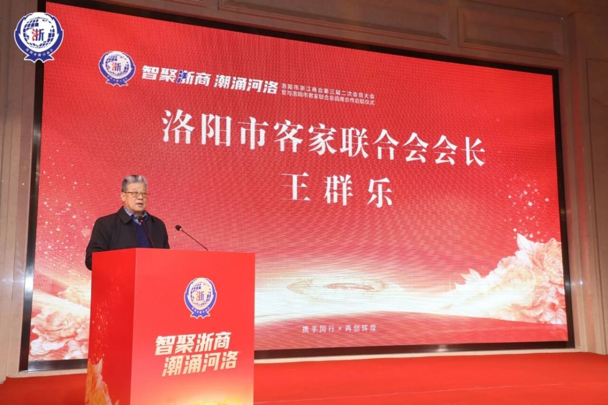 洛阳市客家联合会会长王群乐登台致辞,深情阐述了此次合作的深厚意义。他表示,洛阳是客家儿女的精神原乡,浙商是敢闯敢拼的商业先锋,两者虽地域有别、源流各异,却都怀揣着“扎根一方、造福一方”的赤子之心,都传承着“崇文重商、开拓奋进”的精神基因。“今日我们携手,是文化的同频共振,是精神的一脉相承,更是发展的同向而行。”王群乐会长的话语真挚而有力,他期待以此次战略协同为起点,让客家文化的根脉与浙商精神的活力深度交融,在河洛大地上共同书写跨界合作、共赢发展的崭新篇章。