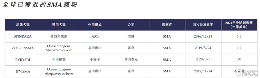 竞争格局方面,目前,全球有四种已获批的SMA药物,以及五种在研的SMA候选药物。其中,中国有两种已获批的SMA药物,包括百健的反义寡核苷酸(ASO)疗法,与罗氏的小分子疗法。