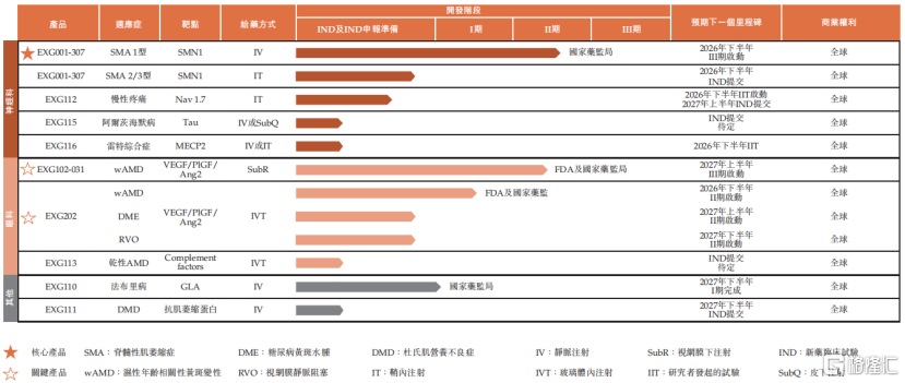 2、两款关键候选产品,即EXG102-031,一种用于治疗湿性年龄相关性黄斑变性(wAMD)的基于AAV的基因疗法;EXG202,一种用于治疗眼底新生血管疾病的基于AAV的基因疗法。