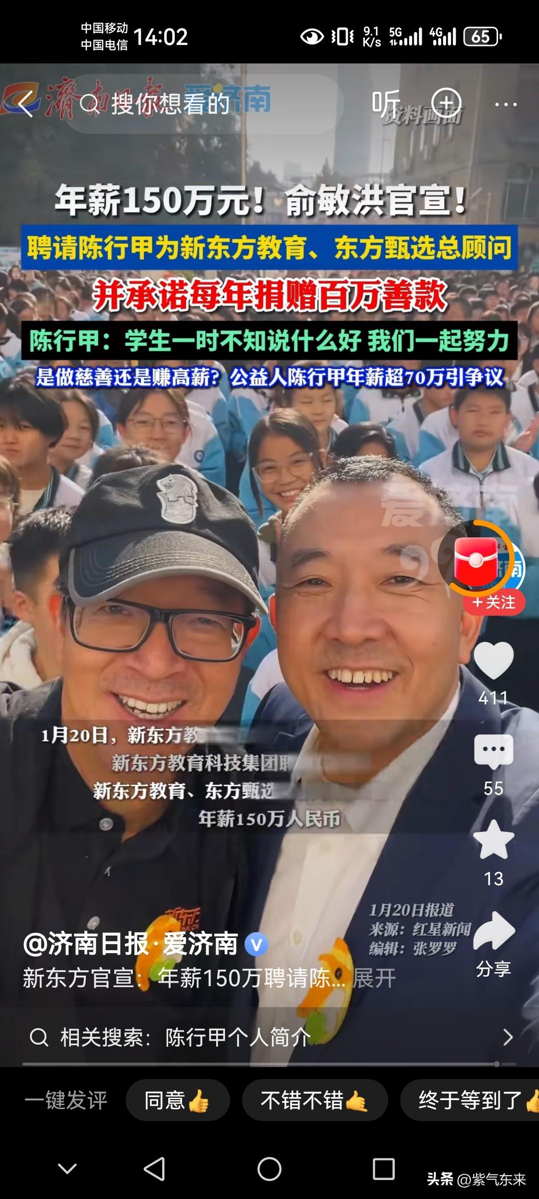看来陈行甲弃政从商是明智的选择,赚的盆满钵满! 陈行甲不光出了书,赚了不少! 这又被俞敏洪聘请担任新东方、东方甄选的总顾问,年薪更是达到150万人民币! 俞敏洪承诺每年捐出100万人民币善款用于做慈善! 陈行甲也很谦虚表示:学生一时不知道说什么好,我们一起努力! 陈行甲很谦虚,很谦卑! 相信陈行甲和俞敏洪强强联合,再创辉煌! 俞敏洪新东方、东方甄选有流量有平台,陈行甲有影响力! 珠联璧合,一定会越来越好!陈行甲俞敏洪 陈行甲回应俞敏洪150万年薪邀请 新东方