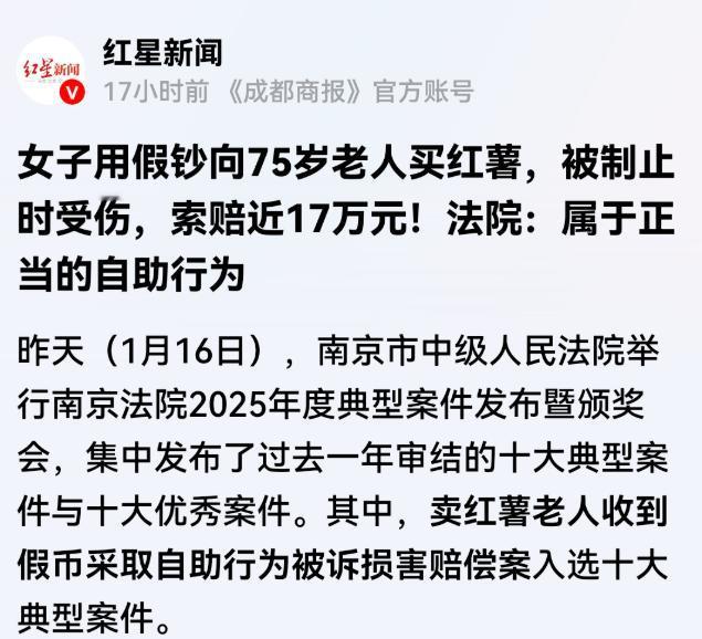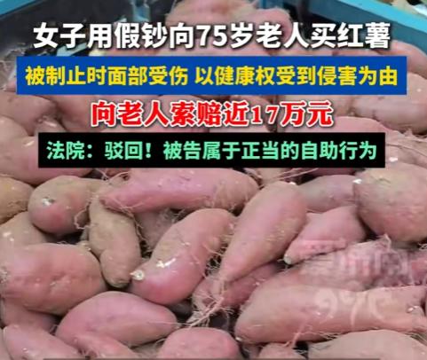 南京,75岁老人卖红薯,一女子用假币购买老人红薯。几天后,女子再次去老人摊前买红薯,被老人及其女儿认出,在把她扭送去派出所的过程中,致女子面部受伤。民警到场后,查实女子非法使用假币600元,对她拘留7日。事后,女子起诉到法院,要求卖红薯老人和其女儿赔偿她损失168253.06元 “赔我十六万!”一张法院传票递到75岁卖红薯的滕大爷手上时,他浑浊的眼睛看了半天,手开始止不住地抖。 他怎么也想不通,那个用假钱骗他的女人,被警察抓走了,怎么还能把他给告了。 时间倒回2023年2月17日,南京一个农贸市场里,风冷得刺骨。滕大爷呵着热气,守着面前一小堆自家种的红薯。一个穿着不错的女人蹲下来,挑了几个,递过来一张百元钞票。 “你这钱……怕不对吧?”老人手糙,但对钱的感觉很准。他摸了一下,然后掏出老花镜,对着光费力地看。 眼看情况不对,女人瞬间变了脸,抓起红薯就想走。 “你别走!”老人的女儿滕女士当时就在旁边,一步堵在了前面。女人想挣脱,推搡之间,脸擦在了地上,破了皮。周围的摊主也都围了过来,有人赶紧报了警。 警察来得很快。从那个女人,王某某,随身带的包里,摸出了整整六张百元假钞,号码一模一样。事情清楚得不能再清楚,王某某因为使用假币,被依法行政拘留七天。 滕大爷父女松了口气,觉得天理昭昭,坏人总算得了报应。他们继续守着那个小小的红薯摊,日子仿佛回到了从前的平静。 直到七个月后,法院的传票直接送到了家里。 原来王某某把滕大爷和他女儿告上了法庭。要求他们父女赔偿医疗费、误工费、精神损失费……加起来168253.06元。理由就一个:抓她的时候,她的脸受伤了,破了相。 “我们用假钞是不对,但已经接受了治安处罚。一码归一码,他们把我弄伤,就得赔。”法庭上,王某某和她的律师语气冷静,逻辑清晰。那些列出的费用单据,看起来有整有零,非常“专业”。 另一边,滕大爷张着嘴,几次想说话,却气得发不出声音。他女儿滕女士红着眼眶,声音带着颤:“她拿假钱骗一个七十多岁的老人,我们抓住了坏人,送她去见警察,我们错在哪里了?天底下有没有这个道理?” 案子到了这里,事情已经很清楚了。但法官要判断的,就是老人父女当时“抓人”的行为,到底合不合法。 警察出具的证明写得很客观:父女俩为制止违法行为人逃跑,进行了控制,并在民警到场后立即移交。没有证据表明,在这个过程中他们有额外的殴打行为。 最终,南京市浦口区人民法院认为,滕大爷父女的行为属于法律上的“自助行为”,具有正当性。 最关键的是那八个字的判词:“法不能向不法让步。”王某某全部诉讼请求,被依法驳回。一分钱都不用赔。 赢了官司的滕大爷,却没有等到真正舒心的日子。这场官司前后拉扯了近两年,耗尽了老人的精神。 2024年底,胜诉判决书送到时,他已经很少能出门摆摊了。女儿把判决书念给他听,老人只是点点头,没说话。 五个月后,滕大爷去世了。他没能看到,自己这个小小的案子,后来被选为“南京法院年度典型案件”。判决书里那八个字,被很多媒体做进了标题。 农贸市场依旧嘈杂热闹,那个红薯摊早就换了主人。而那个索赔十六万的女人,败诉后,再也没人见过她。 归根结底,法律是不会让老实人不吃亏,让耍横的人占便宜。它是每一个普通人面对不公时,都该有的那份底气,是每个人心里那杆“天理昭昭”的秤。 信息来源:《南京法院发布年度典型案例|卖红薯老人智斗假币骗子获法院力挺》 文|灰度场 编辑|南风意史