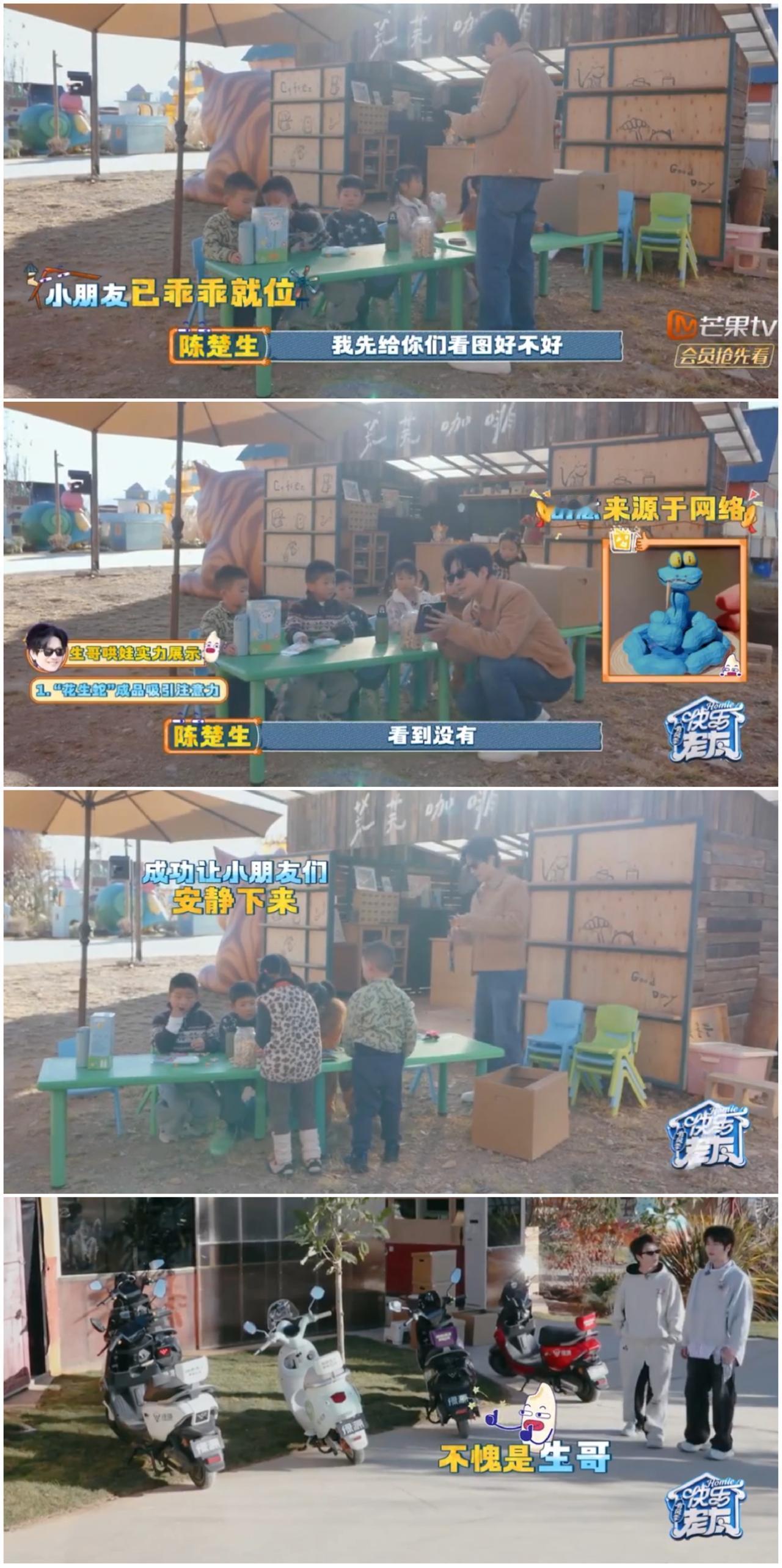 张远想不到陈楚生有这能耐, 看到这一幕, 张远等其他兄弟深深佩服。 张远6人阔别一个月, 重返丽江录制节目, 他们这次迎来了一批特殊客人, 就是6个幼儿园的小朋友。 于是他们6人都忙着各种 跟小朋友们玩耍, 一般人都需要6个人一起帮忙带。 但是陈楚生胆敢一个人 带着6个孩子一起做 手工蛇。 其他5个人看到陈楚生 一个人带着孩子们, 那么得心应手, 深感佩服。 这样看来, 陈楚生经常带儿子们做手工, 真的有抽时间陪伴儿子, 而不是当甩手掌柜, 不然不会当下那么娴熟的。 陈楚生来录制这个节目前, 为了遵守每年给儿子做南瓜灯的约定, 于是出发录制前 “奋战”到凌晨四点, 才把南瓜灯完成。 随后拖着疲惫的身体 坐上去往丽江的飞机。 你看, 陈楚生不光歌唱得好, 而且对于孩子都那么有耐心与爱心, 真的又圈粉无数了。