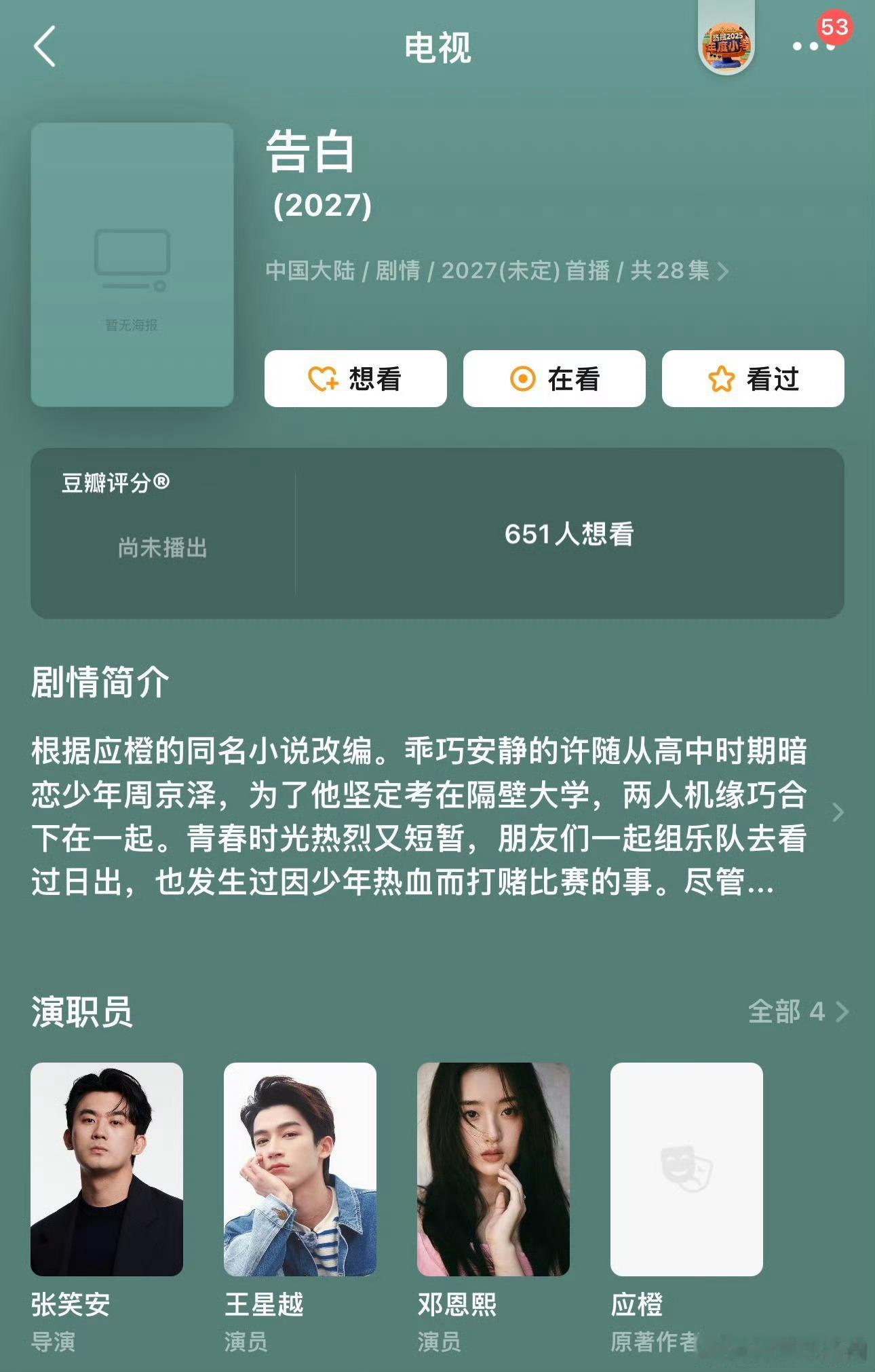 告白开通官博了!不知道最后的演员是不是网传的王星越和邓恩熙告白开通官博
