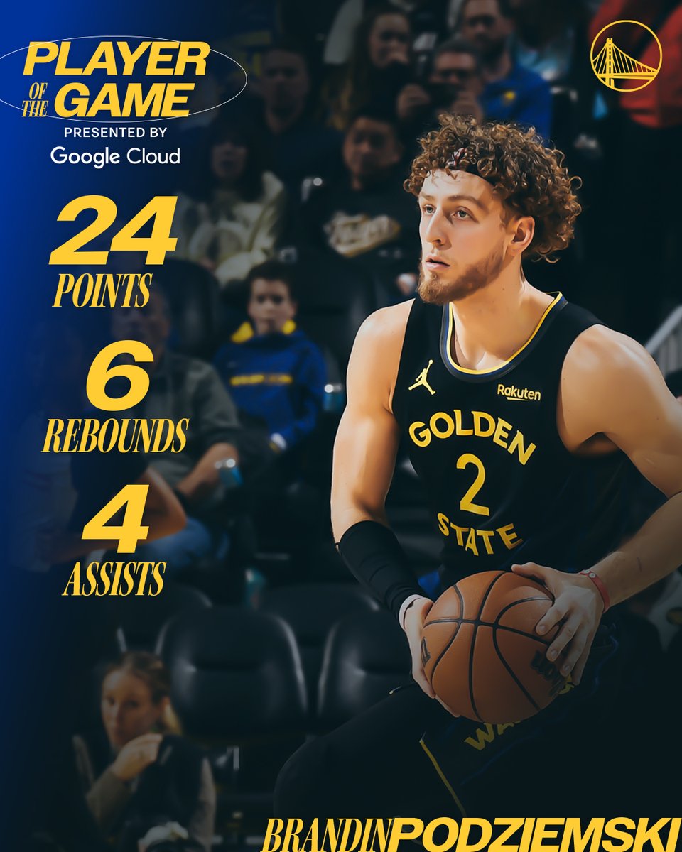 勇士官方账号报道,布兰丁·波杰姆斯基(No.2)创下赛季得分新高@googlecloud||本场最佳球员