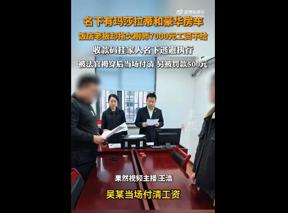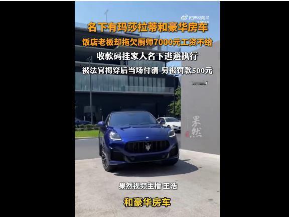 上海饭店老板吴某名下有玛莎拉蒂、豪华房车,却拖欠厨师7000元工资,还将收款码挂家人名下逃避执行,谎称在外进货欺骗法官,最终被当场撞见拘传,在法律威慑下付清工资,获提前解除拘留并罚款500元。 名下豪车傍身,却连7000元工资都不愿支付给厨师;一边谎称在外进货逃避责任,一边在饭店从容指挥备菜,吴某的操作充满了讽刺与冷漠。 这场看似金额不大的欠薪纠纷,不仅刺痛了劳动者的心,更折射出部分经营者诚信缺失、漠视劳动权益的痛点,值得深思与警醒。 欠薪的核心,是对劳动者价值的否定与权益的漠视。 7000元对坐拥玛莎拉蒂、豪华房车的吴某而言,或许只是一笔微不足道的开支,但对靠手艺谋生的厨师来说,却是辛勤付出的回报,是维持生计的底气。 吴某宁愿花费心思转移资产、编造谎言逃避执行,也不愿按时足额支付工资,本质上是从心底不认可劳动者的劳动价值,将员工的付出视作理所当然,把逐利凌驾于责任与良知之上。 这种行为不仅寒了员工的心,更破坏了雇佣双方最基本的信任,也触碰了法律与道德的双重底线。