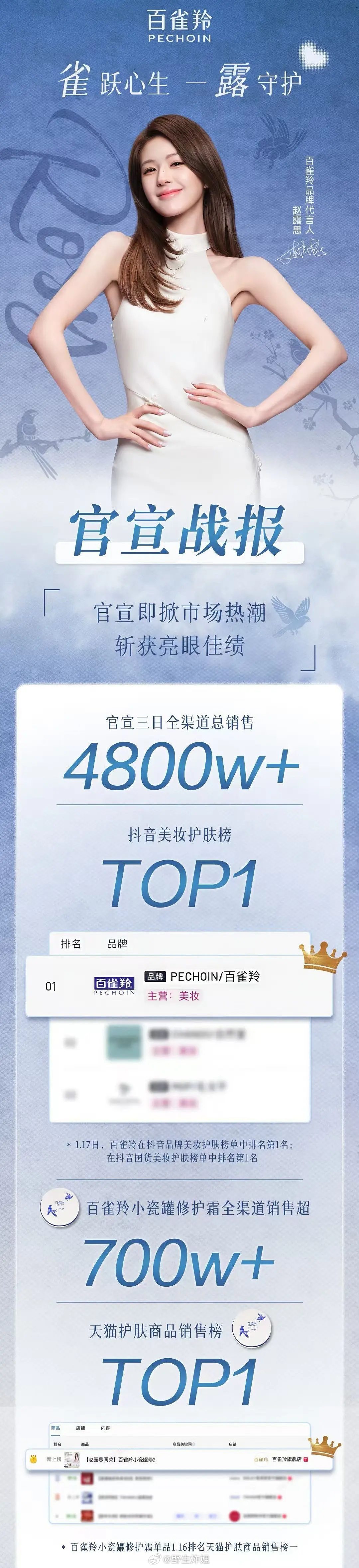 赵露思百雀羚官方战报来了 怎么样? 4800w+官宣三天,销量涨幅之大让官方发战报庆贺,就代表影响力,品牌和代言人双赢