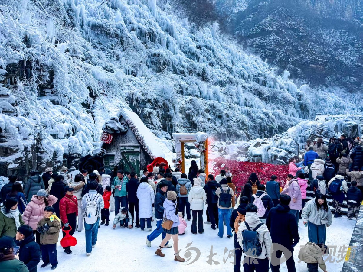红石峡丹崖碧水与白雪相映,勾勒出独特冬日画卷;茱萸峰顶,千峰万壑被白雪覆盖,红墙黛瓦的玄帝宫在雪色映衬下更显庄严;小寨沟魔法童话小镇错落的木屋覆满蓬松白雪,窗棂上的冰花与暖黄的灯光,将童话氛围推向极致;泉瀑峡内,3000米冰瀑群在雪后更显壮观,层层叠叠的冰凌如玉树琼枝,冰瀑与雪崖连成一片,形成“千里冰封,万里雪飘”的浩瀚奇景。