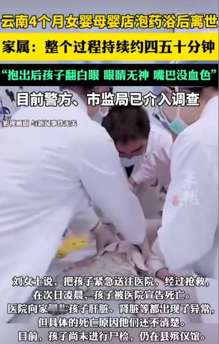 云南曲靖罗平县,一场本想给宝宝驱寒的药浴,却成了一场悲剧。 1月16日下午1点多,马街镇的刘女士带着四个半月大的女儿,走进了镇上一家母婴店。 孩子有点感冒咳嗽,听朋友说这家药浴管用,她特意问了店员“这么小的娃能不能泡”,得到肯定答复才放了心。 伸手试水温时,刘女士觉得有点烫,店员却说“药浴就得这温度才见效”,也没说清浴里加了啥药材。 泡了四五十分钟,孩子起初哭闹,拉着小脚就安静了,看着像睡着了。 下午2点10分抱出来时,刘女士心里咯噔一下:娃翻白眼、眼神发直,嘴唇白得没一点血色。 她急着喊不对劲,店员还说“就是困了,抱会儿就好”,磨蹭一两分钟才帮忙穿衣送医。 先送马街镇卫生院,又紧急转罗平县人民医院,可孩子还是没挺过来,17日凌晨被宣告离世。 医生说,孩子肝肾等脏器都出了异常,具体死因还没查明,遗体现在还在殡仪馆等着尸检。 1月19日,记者联系涉事母婴店老板陆女士,对方先扯信号不好,追问后就说“不方便”,挂了电话。 当天下午,马街派出所和马街市监所都证实,已经介入调查,其他情况暂时没法说。 这场悲剧里,超标的水温、过长的时长、不明的药材,每一点都戳着家长的心窝子。婴幼儿泡药浴 药浴法 儿童水疗药浴