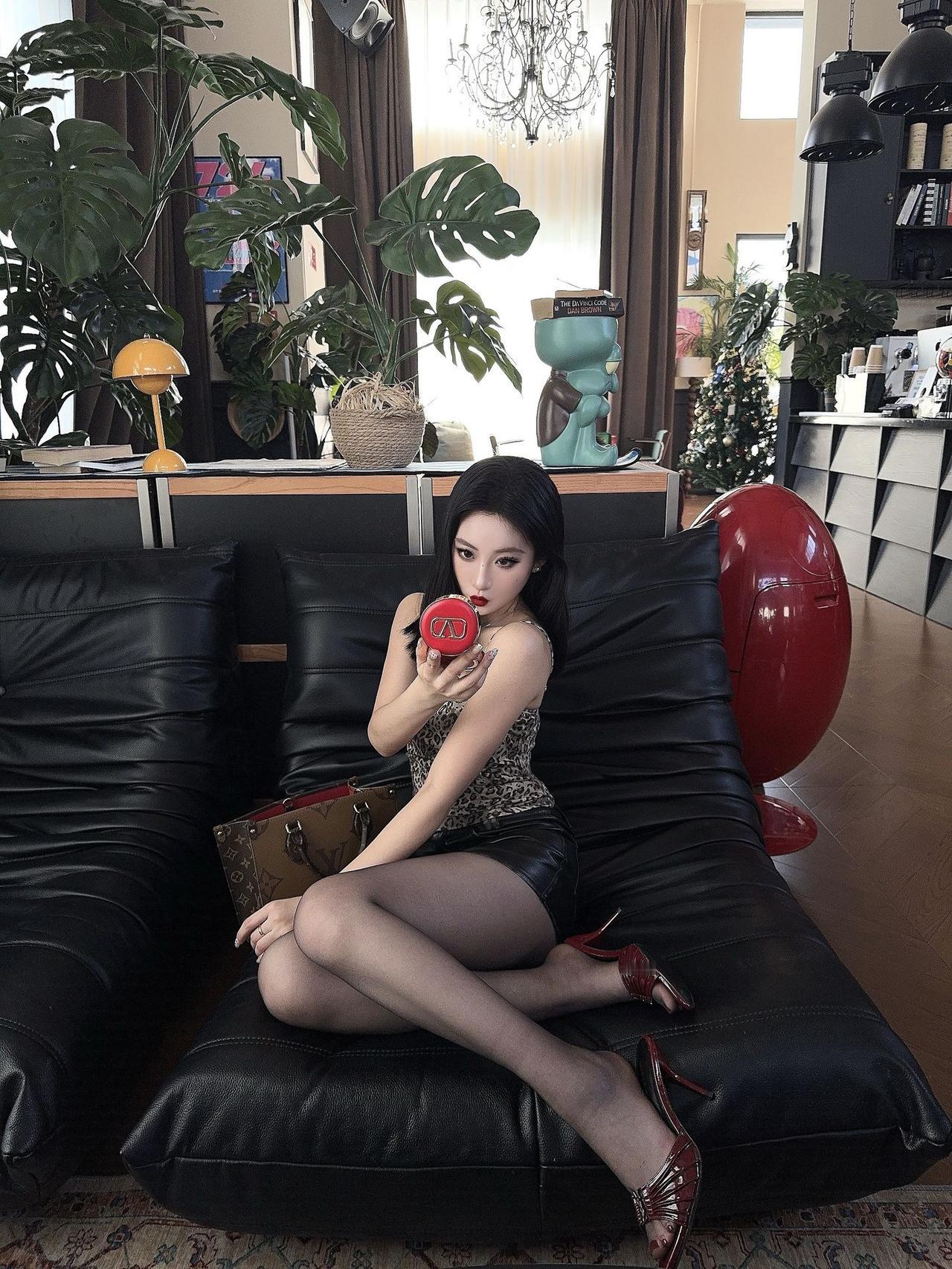 优雅黑皮沙发,性感豹纹连衣裙,红唇高跟鞋,完美都市女性。