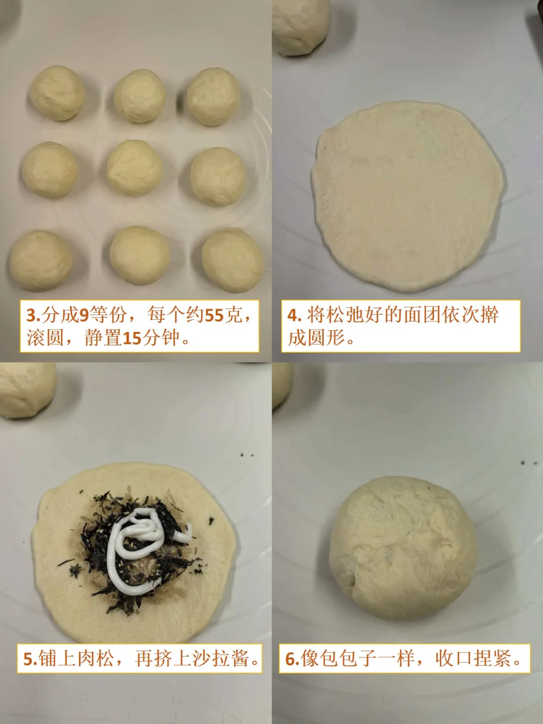 3.将松弛好的面团依次擀成圆形,铺上肉松,再挤上沙拉酱,像包包子一样,收口捏紧。