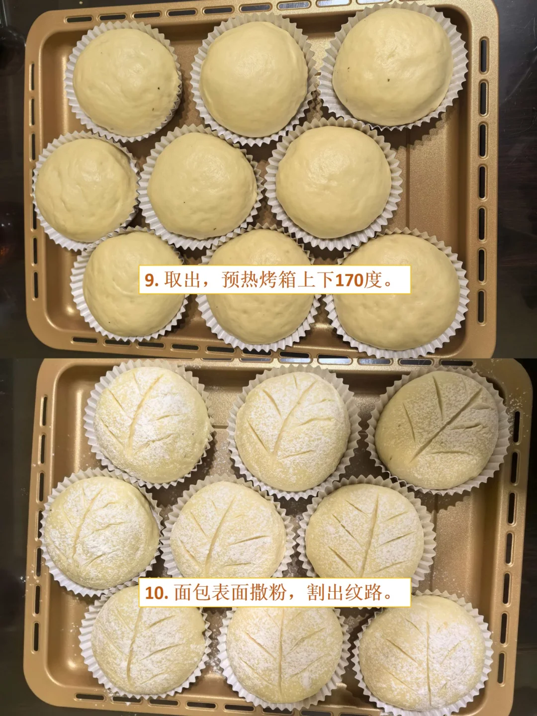 6.取出,预热烤箱上下170度,面包表面撒粉,割出纹路。