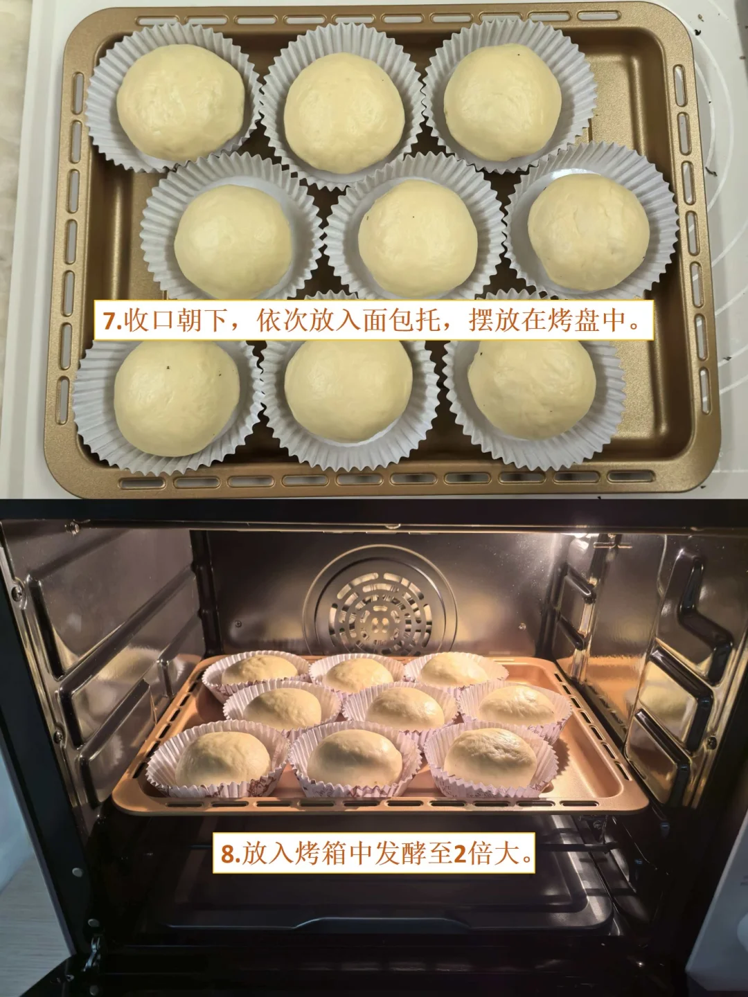 4.收口朝下,依次放入面包托,摆放在烤盘中。