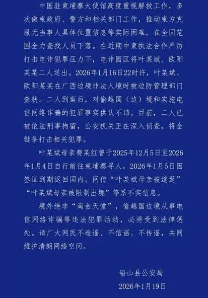 叶文斌已找到,警情通报系自愿出境从事诈骗
