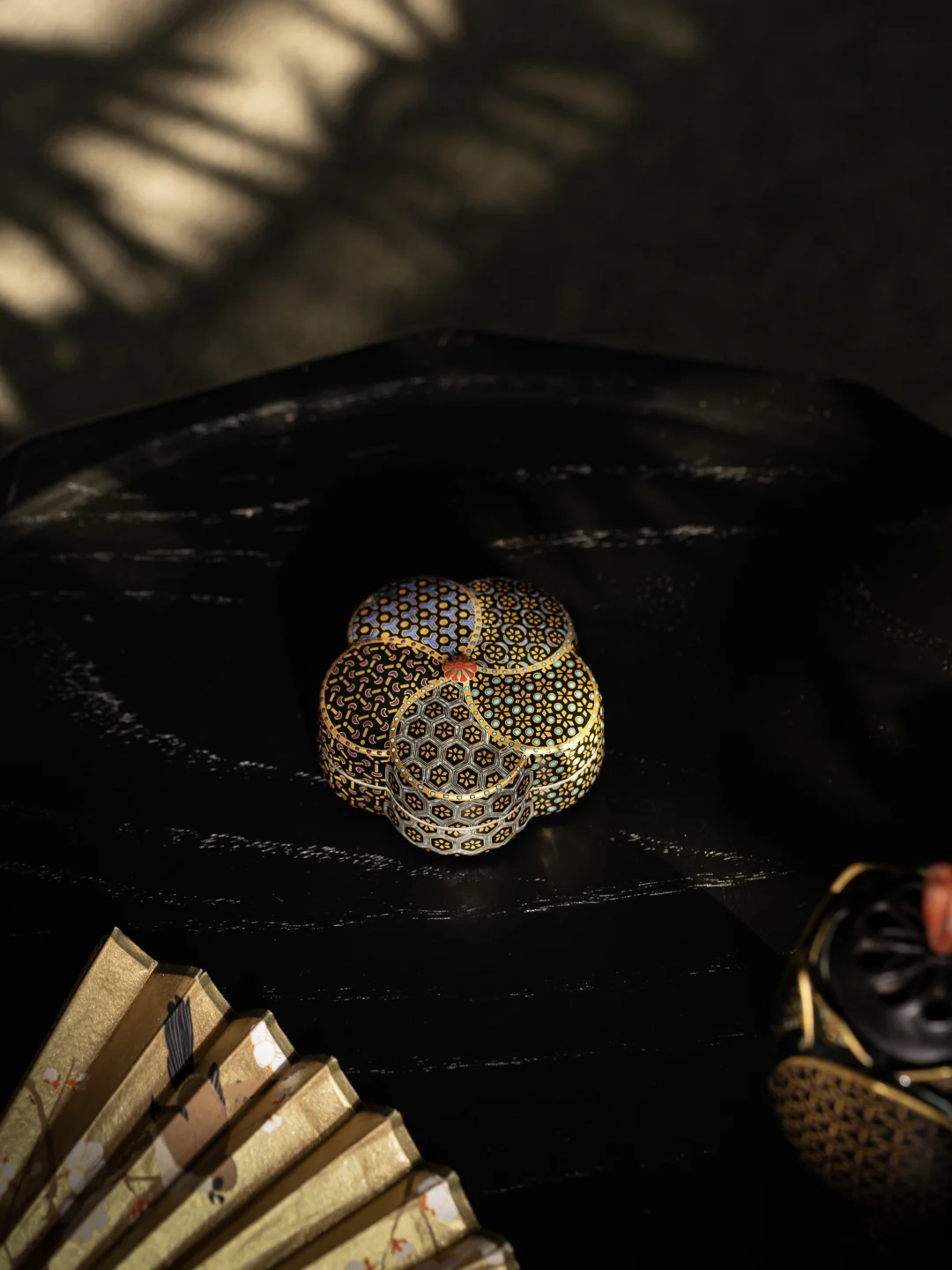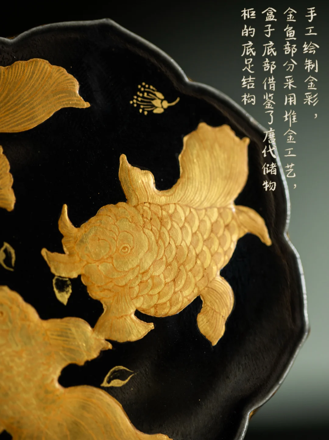 灵感取自唐代风物,底足镂空,细节考究。堆金工艺勾勒的金鱼立体灵动,寓意“金玉满堂”。它亦是首饰盒、印泥盒,是案头一抹不言自明的富丽祥瑞。