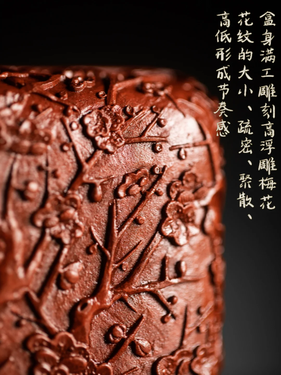 以陶瓷复刻明代剔红漆器的高浮雕梅花,花瓣起伏富有节奏。实现了漆的温润与瓷的坚实,置于茶席或书案,自成一方清雅气韵。