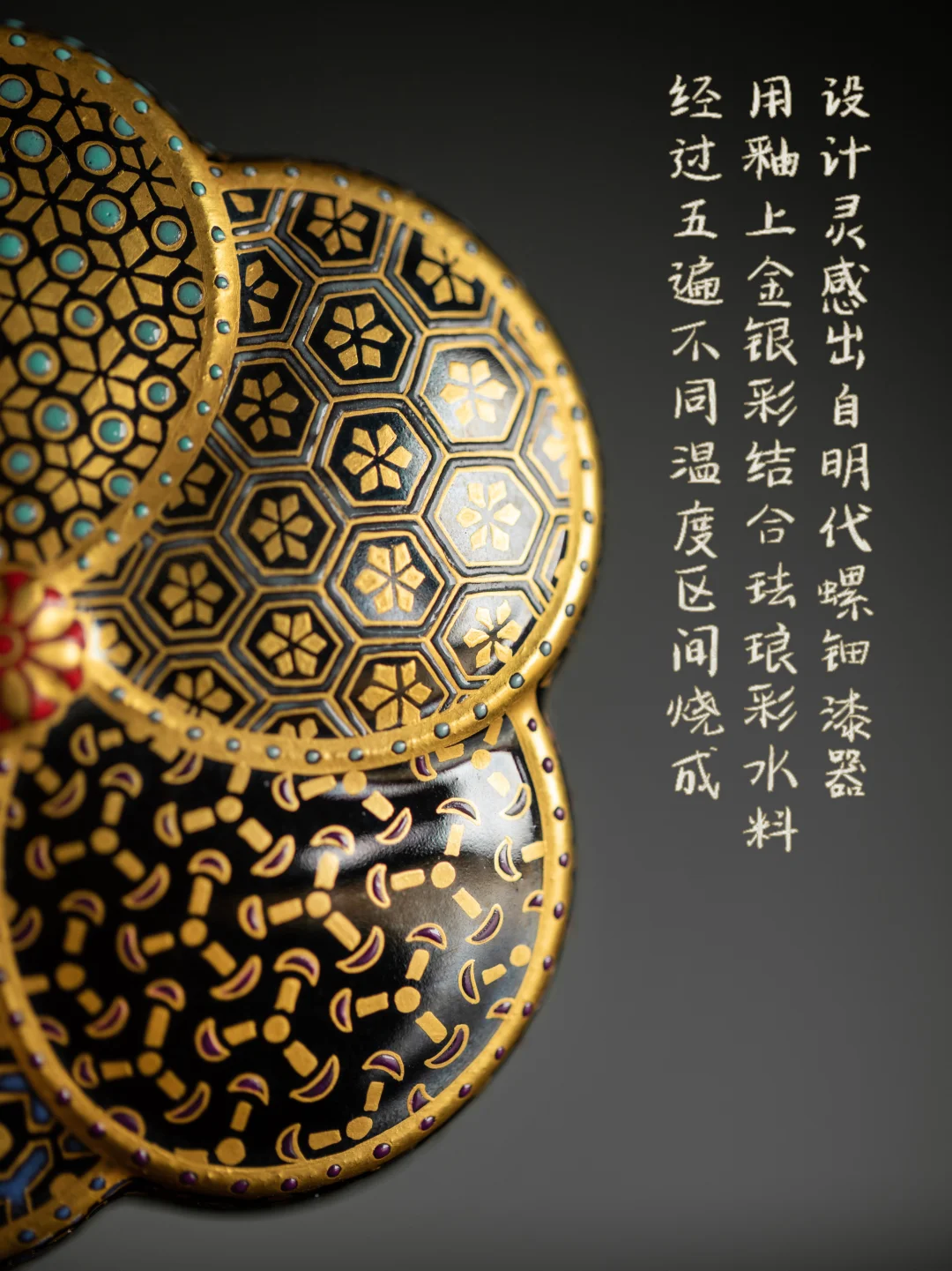 陶瓷仿明代螺钿漆器,金银彩与珐琅彩经五次窑火淬炼,光华流转如星河。它本身即是一件微型艺术品,绚丽非常,适合作为博古架上的视觉焦点。