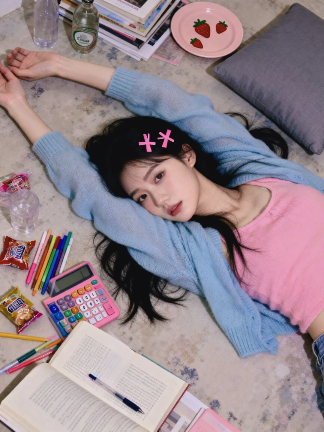 不用刻意布置!直接用家里的地毯当背景,散放手边的书本、文具、小零食(像图里的彩色笔 + 糖果),道具不用摆得规整,“乱中有序” 的散落感,反而能拍出日常松弛的氛围~