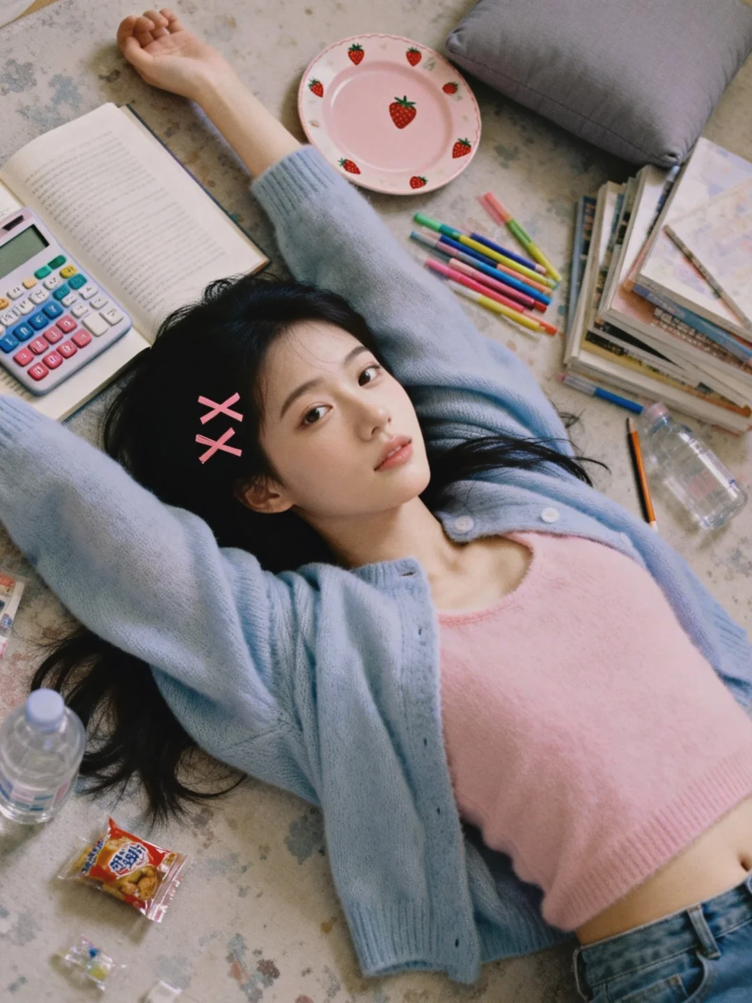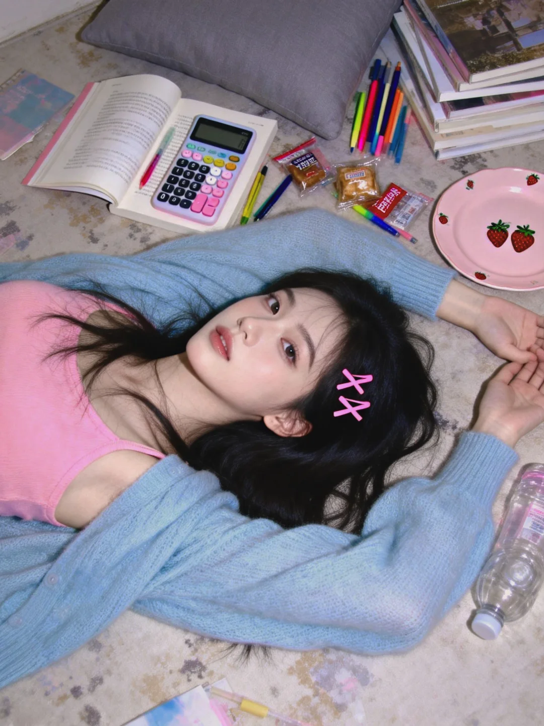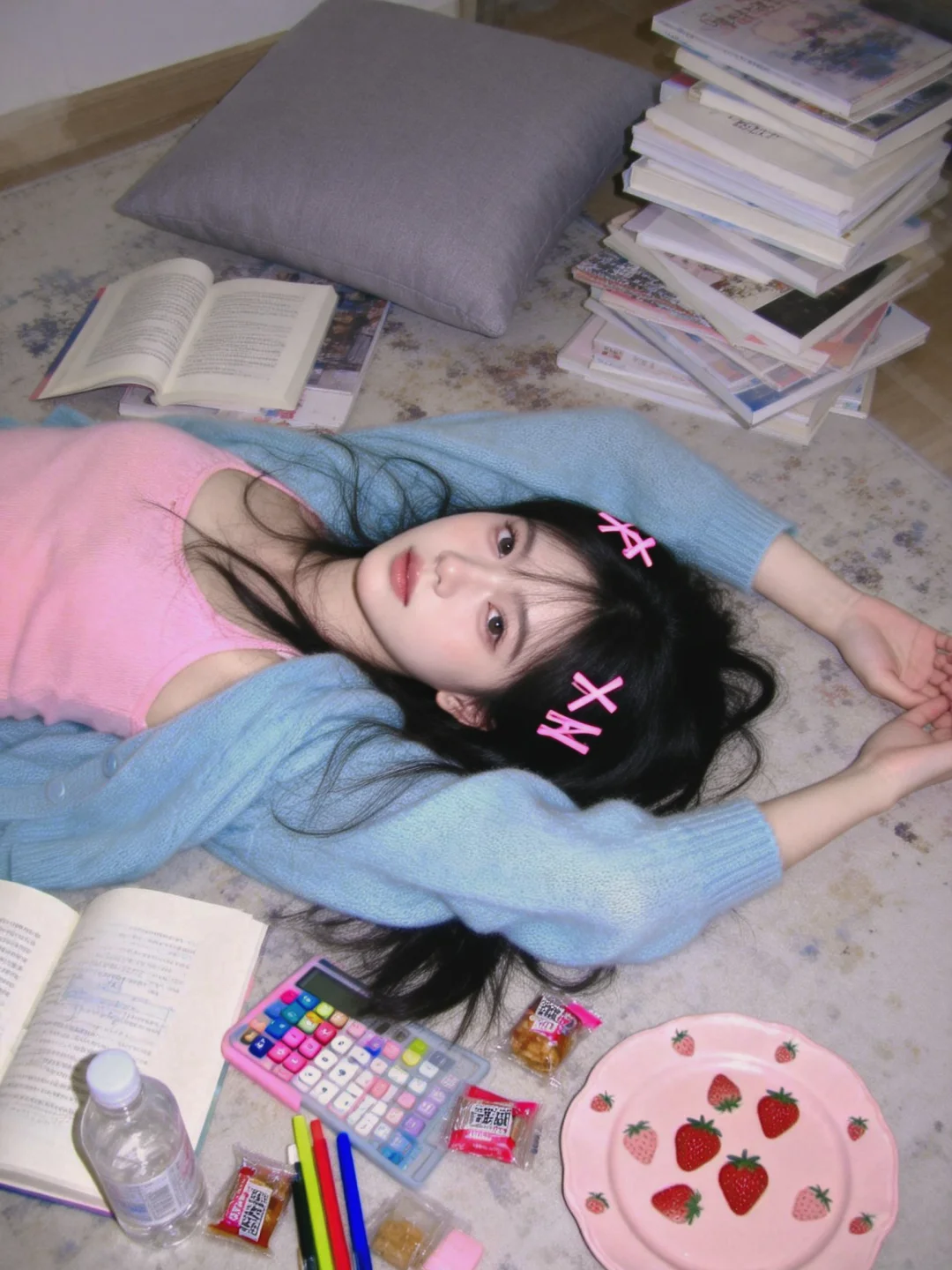 主色调选浅蓝、淡粉这类低饱和柔色系(针织衫 + 内搭的搭配),再用小配饰当视觉亮点 —— 比如粉色叉叉发夹,亮色不用多,一个就能让画面清新又有记忆点~