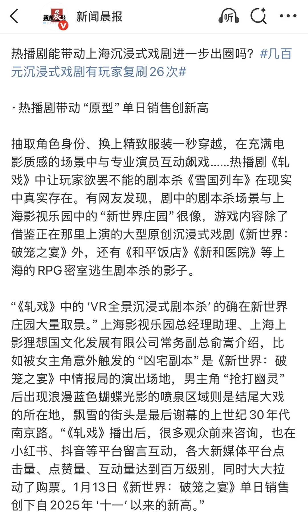 《轧戏》这波真的赢麻了! 不仅剧火,更是实打实地带动了上海的文旅消费。根据官方披露的数据,这绝对是“影视+文旅”的优质案例! 🔥线上流量变现:百万级互动 《轧戏》播出后,直接拉动了实景地“新世界庄园”的热度。观众在、等平台的咨询、留言互动量迅速达到【百万级别】,流量直接转化为购票动力。 🔥单日销量创纪录 受剧集热播影响,取景地项目《新世界:破笼之宴》在1月13日的单日销售额,直接创下了自2025年“十一”以来的新高。 一部剧带火一座城,这数据看着是真安心!👏