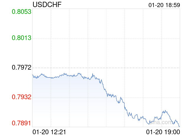 新浪外汇消息2026年01月20日,截至18时59分,外汇市场上美元兑瑞士法郎汇率跌破1美元兑换0.7892瑞士法郎。跌幅为-1.0035%