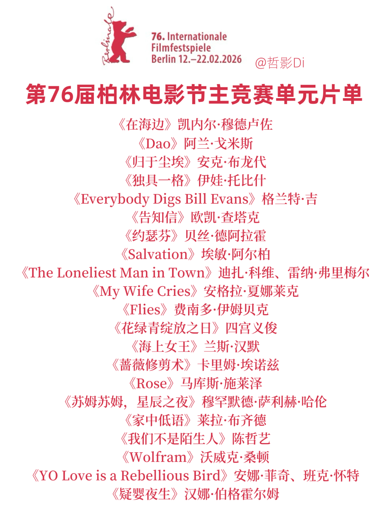 2026柏林电影节片单第76届柏林电影节公布主竞赛单元片单,共有21部影片,陈哲艺的新片《我们不是陌生人》作为华语片独苗入围,该片将与艾米·亚当斯主演的新片《在海边》、桑德拉·惠勒主演的《Rose》共同竞争本届柏林电影节金熊奖。
