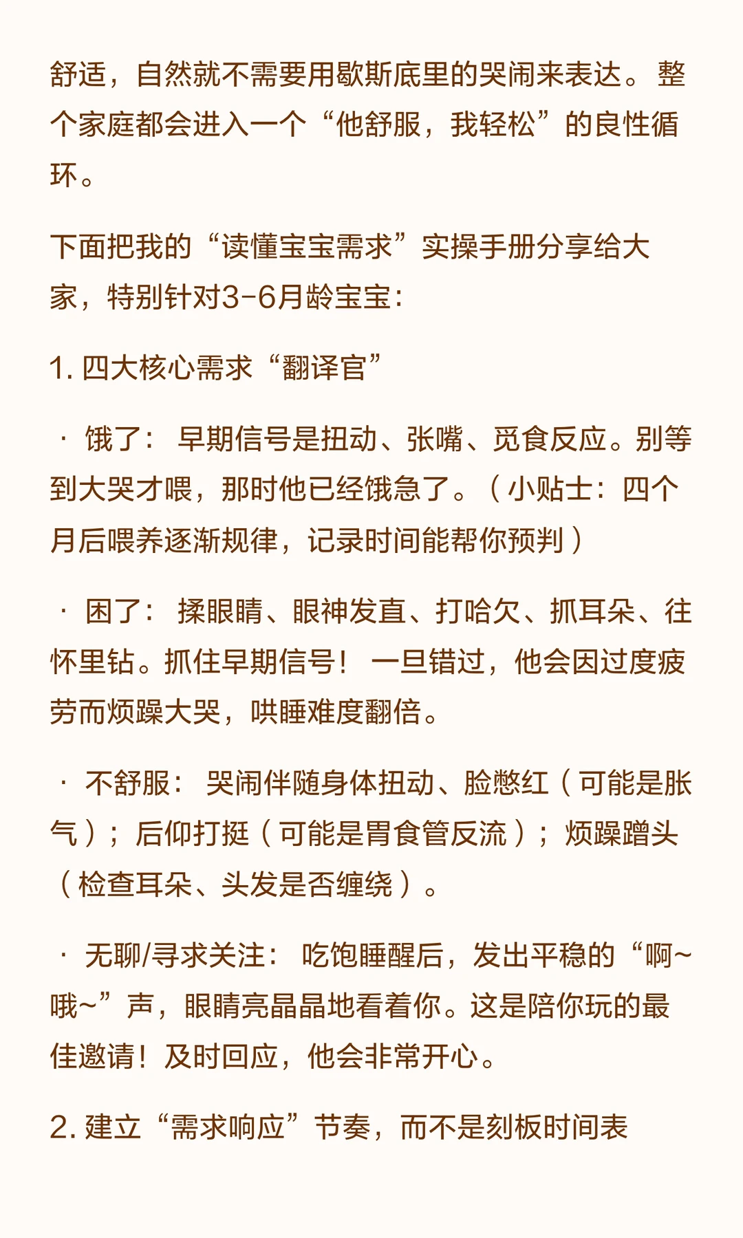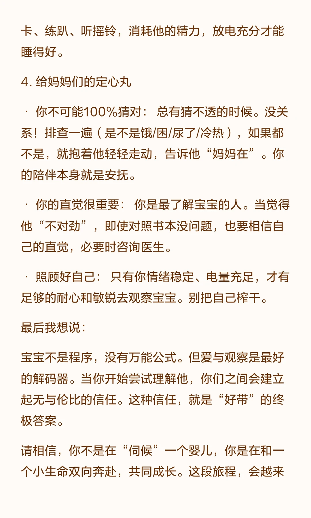 读懂宝宝需求是“好带”的关键。通过观察饥饿、困倦、不适和无聊的信号,及时响应并提供高质量陪伴,建立安全感。妈妈的直觉和情绪稳定同样重要,信任与理解是成长的基石。