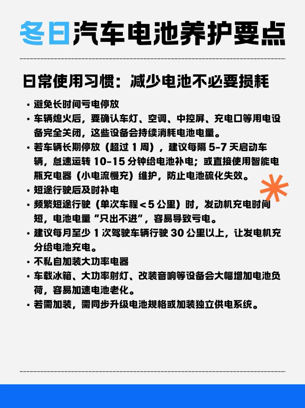冬天一到,很多车打不着火?多半是电池在“闹脾气”!低温会让电池容量骤降,养护不到位更容易提前退休🪫 日常习惯是根本1️⃣熄火后一定确认大灯、空调、中控屏全关,别让它们偷偷耗电2️⃣长期不开(超1周)建议每隔5-7天启动10-15分钟,或直接用充电器维护3️⃣短途通勤(单程<5公里)每月至少跑一次30公里以上长途,让电池“吃饱”🔍 定期检查不能少每月看一眼电池:外壳有无鼓包漏液,电极有无白绿色氧化物(氧化了就用热水冲净,涂凡士林)测电压:熄火时12.3-12.7V为正常,启动后13.8-14.5V为佳每年做一次专业检测(尤其2年以上的电池),该换别将就❄️ 低温应对技巧1️⃣启动前先关空调、大灯等大功率设备,减轻电池负担2️⃣露天停放可考虑加装电池保温套3️⃣若亏电打不着,用搭电宝或搭电线(一定“正接正、负接负”),启动后多跑跑充电⚠️ 注意:私自加装大功率电器(冰箱、强光灯等)很伤电池,要装就同步升级电池或独立供电汽车大v聊车