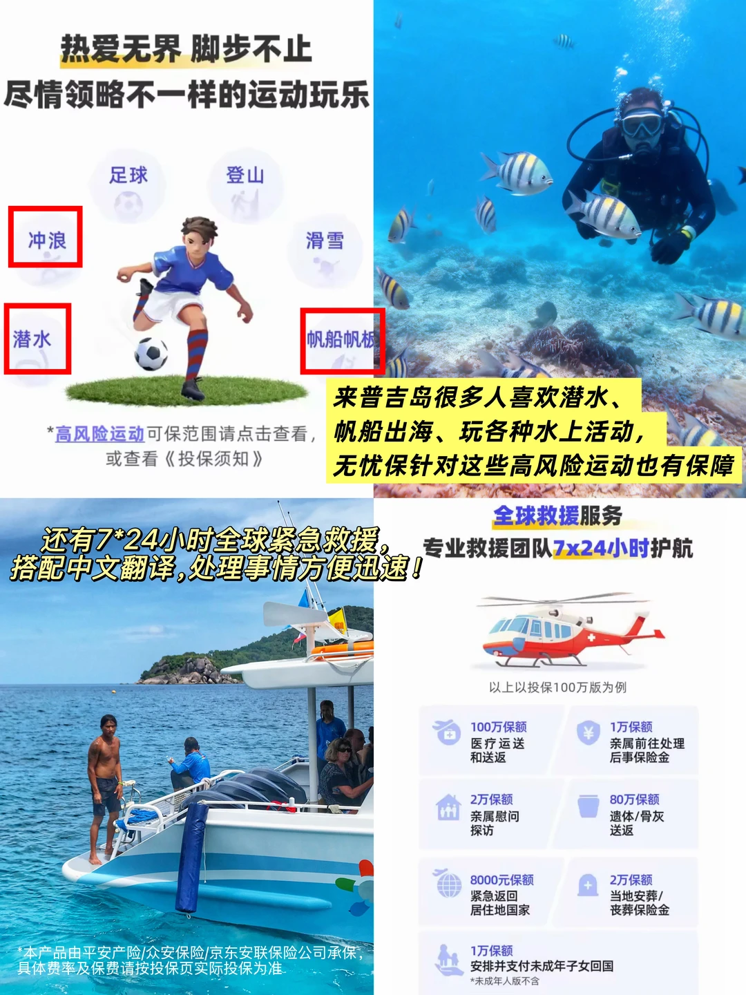 出国海岛旅游喜欢潜水、跳伞、帆船出海、玩各种水上活动的,无忧保也提供高风险运动保障,遇到难题有7*24小时全球紧急救援来帮忙,搭配中文翻译,处理事情方便迅速!