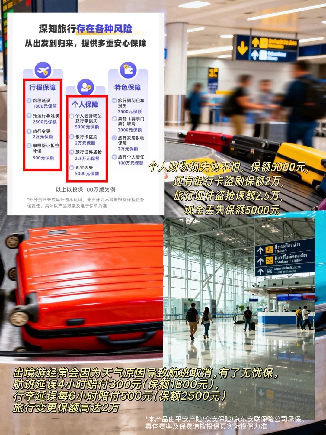 经常出门的朋友也知道,航班延误取消是偶会发生的事情,出境游经常会遇到台风天,刮风大暴雨航班无法正常起飞,导致航班取消,行程也跟着要变更,但有了保险,航班延误保额1800元(延误每4小时赔付300元),行李延误也有2500元保额(延误每6小时赔付500元)旅行变更保额高达2万。