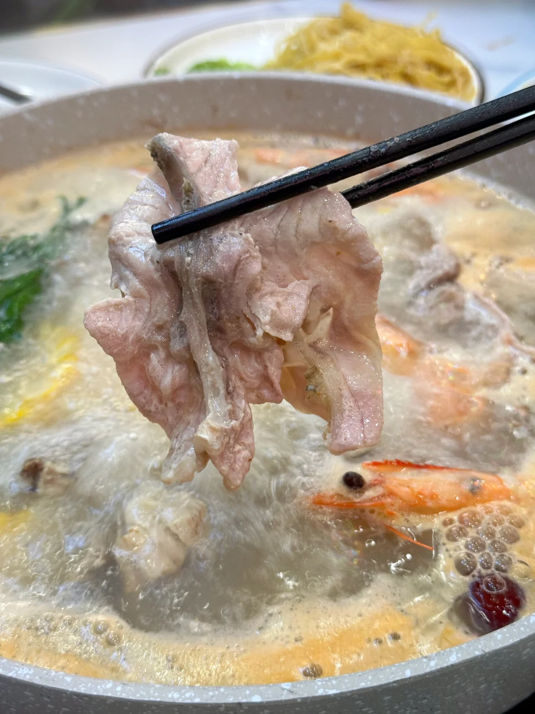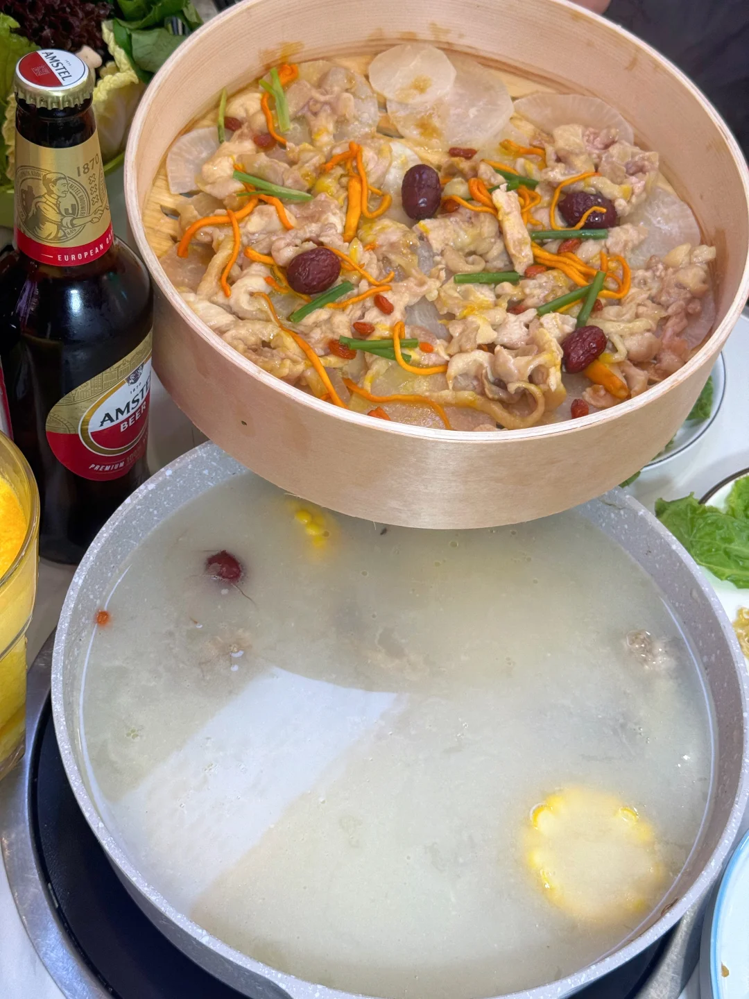 下层是五指毛桃+鸡架熬的高汤,煮到微微甜超鲜,秋冬喝一口直接暖到胃里~