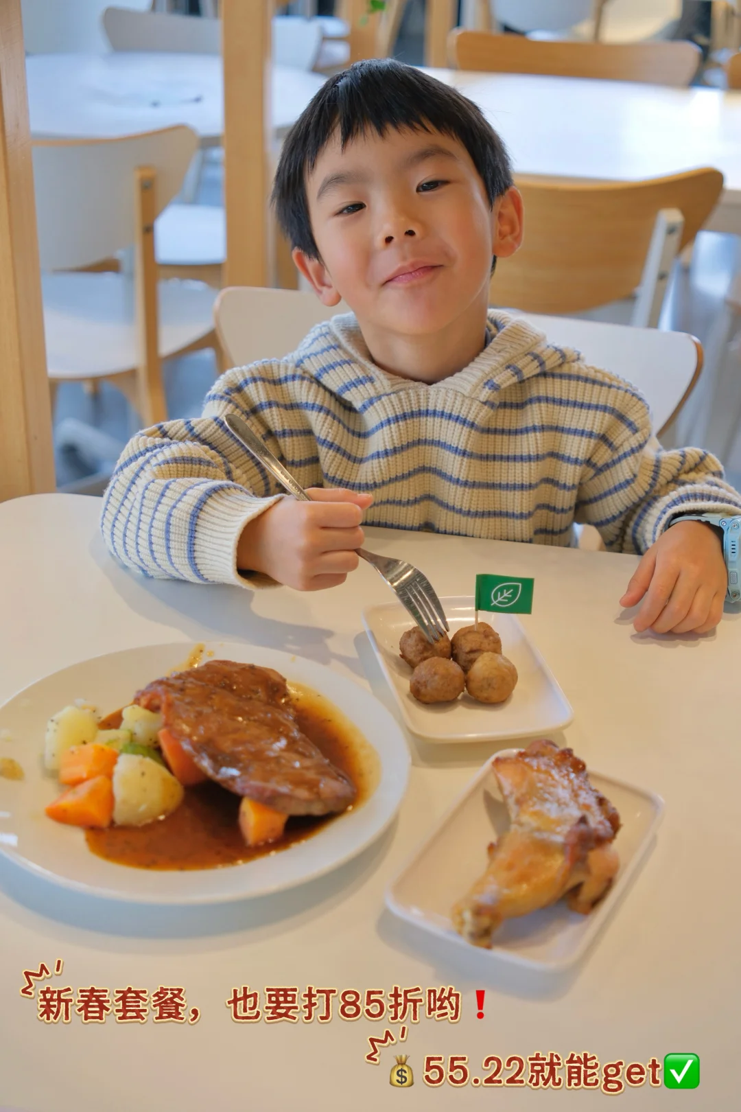 逛饿了就去宜家餐厅吃一顿美味!看到新出的新春套餐真的巨划算!牛排+4粒肉丸+鸡腿,85折只要💰55.22!再加一份肉酱意面,一份提拉米苏,一家人吃得可满足啦[飞吻R]