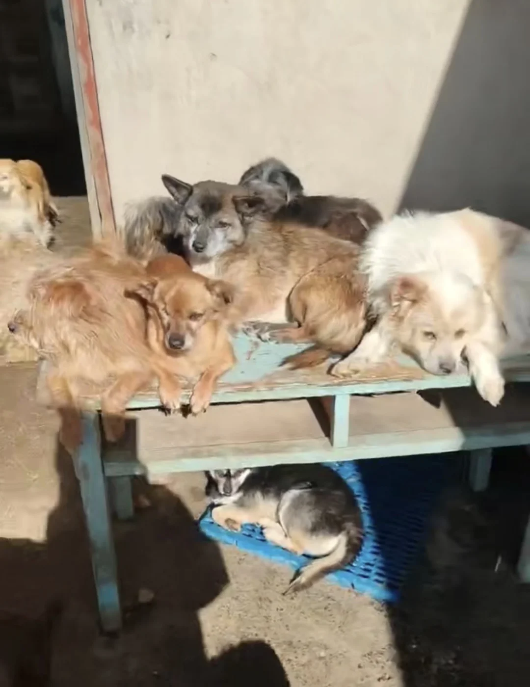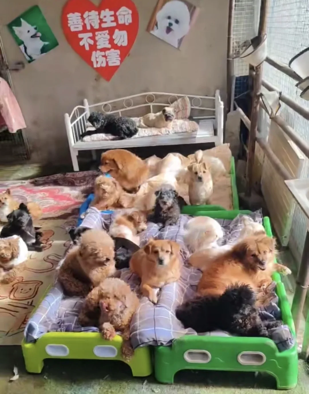 这里的狗狗,有的是被遗弃的流浪儿,有的是从狗肉馆里拼死救出来的幸运儿,还有的是车祸等各种意外导致残疾的可怜狗儿们。它们曾满身伤痕、瑟瑟发抖,是阿姨用尽了毕生给了它们现在这个遮风挡雨的港湾。