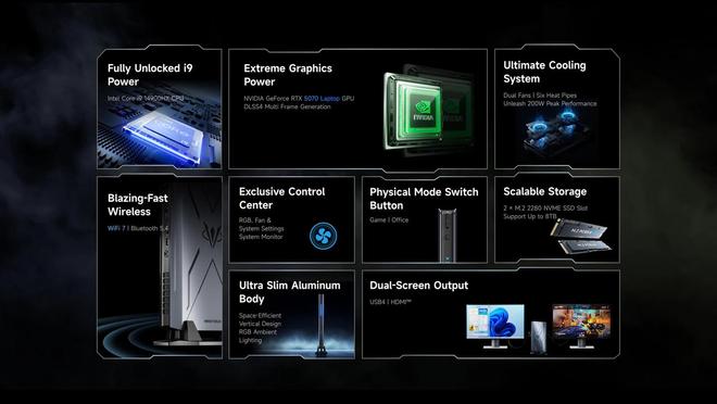 规格方面,这款迷你主机搭载英伟达RTX5070Laptop显卡,拥有6根热管、双风扇以及三面出风散热系统,开启游戏模式时,整机功耗可达200W,而在办公模式下,功耗上限则是150W。