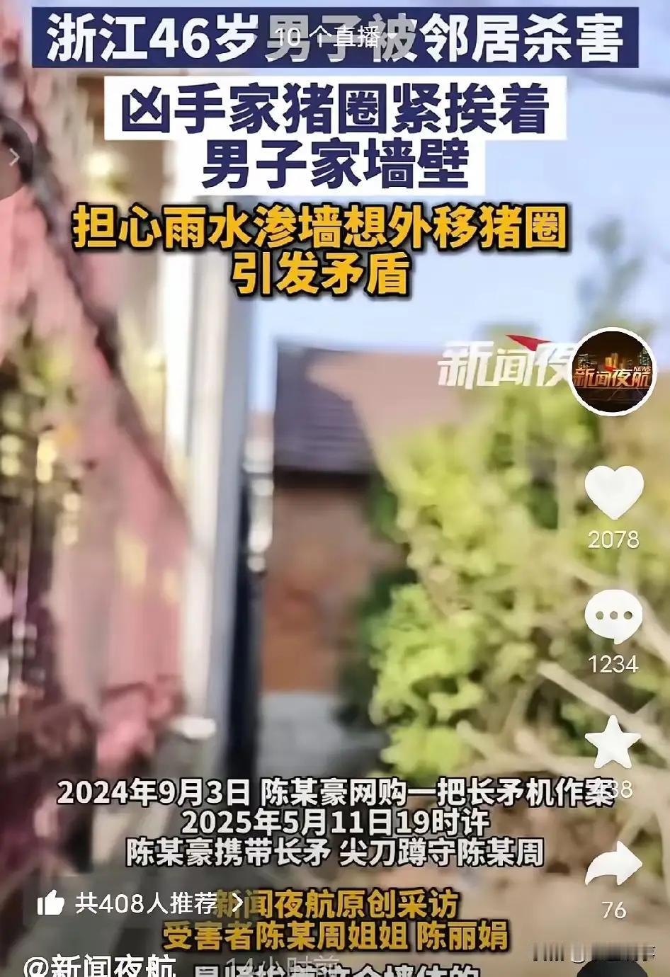 必须严惩!浙江台州邻里因猪圈占地结怨,凶手竟提前半年网购长矛,46岁陈某被连刺心脏十余刀惨死,70岁老父也遭捅伤,老人绝望质问戳碎人心,凶手行凶后竟主动报案!1月21日开庭,家属只求偿命! 2025年5月11日晚上7点,浙江台州天台县,46岁的手艺人陈某,怎么也想不到,自己这辈子会倒在离家仅一墙之隔的邻居手里。凶手用的,是一把特意网购、藏了半年的长矛,对着他的心脏,连刺了十余刀。 事情的根源,小到让外人觉得不可思议:一个猪圈。 你是否曾经以为,邻里之间的小矛盾只会在茶余饭后成为笑谈?可偏偏,这个“笑话”背后,却隐藏着人性最黑暗的一面。陈某家养的猪占了邻居家的一块地,虽然没有法律上的明确界限,但这起“占地”引发的争执,却逐渐演变成了血腥的复仇。 有人说,动物养殖本身无可厚非,但当利益与情感交织,矛盾就变得不可调和。更令人震惊的是,凶手提前半年就在暗中准备,网购长矛,仿佛是一场蓄谋已久的“复仇盛宴”。这不是普通的邻里争执,而是一场失控的悲剧。 你能想象吗?一个70岁的老人,亲眼目睹儿子倒在血泊中,绝望中质问:“为什么要杀我儿子?我们只是一点点地占了点地而已。”那一刻,悲痛如同利刃,刺穿了每一个在场人的心。 更令人愤怒的是,凶手在行凶后竟然主动报案!这究竟是一场冷静的谋划,还是某种扭曲的“正义感”?他的行为让人心生疑窦,也让我们反思:在这个社会,法律的底线在哪里?人性的善与恶,到底在哪一瞬间被扭曲? 这起案件的背后,折射出的是人性深处的复杂与矛盾。我们常常以为,只有极端的事件才会引发公众关注,但其实,每一个看似微不足道的矛盾,都可能潜藏着爆发的导火索。我们是否也曾在生活中忽略了那些“微小”的信号?是否也曾因为一时的愤怒,失去理智? 在这个充满不确定的世界里,我们更需要的是理性与宽容。正义不会因为时间的推移而变得微不足道,也不会因为情绪的激动而被轻易抹杀。我们期待法律的公正,也希望每个人都能在冲突中学会自我控制。 这起悲剧,或许只是一个极端的例子,但它提醒我们:当矛盾升级到无法挽回的地步,后果可能比我们想象的更加惨烈。每个人都应该用理智去面对生活中的摩擦,用善意去化解矛盾。 让我们为陈某祈祷,也希望类似的悲剧不再重演。因为,只有严惩那些失控的极端行为,我们才能真正守护这个社会的底线。正义的光芒,终究会照亮每一个角落。邻里案件 邻里纠纷命案
