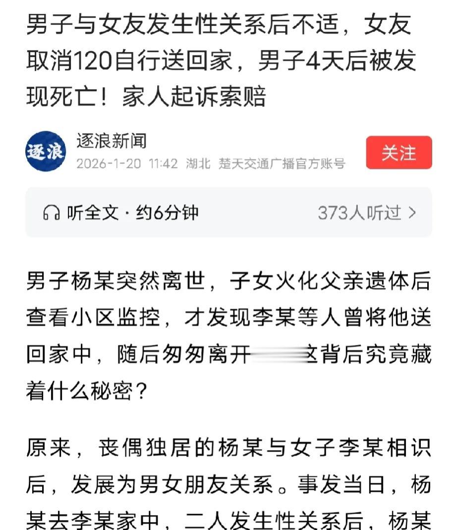 山西太原,男子和女友发生关系后突然感到不适、意识模糊,女友吓坏了,打电话给朋友求助,朋友提醒她打急救电话,不料,女子前一秒刚打完电话,后一秒就后悔了,情急之下她骗医护人员说男子醒了,不用施救取消120救助。之后和朋友等5个人偷偷把男子送回他家后就溜之大吉,4天后,男子的4个孩子发现男子死在家中。他们告上法庭,要求女子和她的5个朋友赔偿31万元并道歉,最终法院这么判。 2023年5月7号,杨某打电话给李某说想去找她聊聊天,李某听了很高兴,她说她在家做好吃的等杨某。 原来,50多岁的杨某早年丧偶,孩子们成家后都搬出去单过了,他自己一个人住在老房子里。 前两年,杨某经人介绍认识李某,两人很快便发展成男女朋友关系。 平日里杨某一有空就往李某家跑,跟她吃顿饭,或者恩爱一番,两人就这样过着幸福的小日子,他们也不谈结婚的事。 5月7号那天,正值周日,两人都不用上班,杨某一早就给李某打电话,说要去找她。 李某知道杨某要来,特地美美地打扮一番,几天没见面的两个人,一见面就如干柴烈火,很快睡到一起。 李某以为,那天会像以往一样,可以开开心心度过,没想到,李某洗好澡从卫生间出来后,她突然发现杨某脸色苍白,一副很难受的样子。 李某赶紧冲过去问杨某哪里不舒服,但是杨某回答得不清不楚,意识模糊。 李某瞬间慌了,就在她急得不知所措时,她想到了好友宋某,她立马给宋某打电话。 宋某了解情况后,提醒李某,让他赶紧拨打120急救电话,先救人要紧。 李某听了才想起来,她赶紧给120打去了电话,接线员了解情况后教李某,不要随意移动杨某,安心等待他们的救护人员。 谁料,李某打完急救电话后,她开始后悔了,她可能想着如果杨某的孩子知道杨某是在她这里出事的,后续会不会找她麻烦,也或许,她不想出这个钱,总之她觉得她真不该打这个电话。 没多久宋某来到了,李某看到宋某像是抓到了救命稻草,她说她不想让150来她家接人,她想把杨某送回家,她问宋某可不可以帮她的忙,宋某点点头。 李某看宋某没说话,随即拿出手机给120急救中心打电话骗他们说,杨某已经醒了,人没事,取消了120的救援。 之后,李某又给李某丙打电话,让他来家里帮忙。 宋某怕人手不够,又给他的朋友樊某、张某打电话,让他们来李某家帮忙。 于是,李某在宋某、李某丙、樊某、张某的帮助下,偷偷把杨某宋回他家中之后就溜之大吉了。 李某以为她做得神不知鬼不觉,她以为自己能安全躲过。 没想到,2023年5月10号,杨某的孩子在家中发现父亲已死亡。 杨某的4个孩子悲痛欲绝,他们不知道父亲经历了什么,不明白父亲怎么会突然撒手离去。 4个儿女怀着悲痛的心情带着父亲火化,想要让他尽快入土为安。 把父亲的后事办妥后,几个儿女回到家查看家中监控,才发现父亲被李某等几个人送回家之后几天都不出门。 当天杨某的孩子报了警,后续经过警方调查,终于了解事情缘由。 但,2024年4月16日人民检察院却以在按证据无法认定,杨某的死亡跟李某不作为行为存在因果关系为由,作出不起诉决定书。 杨某的4个孩子不服,又向法院提起诉讼,要求李某、李某丙、宋某、张某、樊某等合计赔偿杨某死亡赔偿金、丧葬费等合计31万元,并向他们赔礼道歉。 根据《民法典》第1165条规定,行为人因过错侵害他人民事权益造成损害的,应当承担侵权责任。依照法律规定推定行为人有过错,其不能证明自己没有过错的,应当承担侵权责任 。 李某与杨某发生关系后,杨某突发不适、意识模糊,李某因担忧纠纷与费用,故意欺骗120取消救助,并伙同宋某等4人违规转移杨某且未通知家属、未采取任何后续救助措施,该不作为存在重大过错。 虽检察院以证据不足未起诉,但民事诉讼中,该过错与杨某死亡存在高度盖然性的因果关联,李某及四名协助者需承担相应过错赔偿责任。 根据《民法典》第1181条规定,被侵权人死亡的,其近亲属有权请求侵权人承担侵权责任。 被侵权人为组织,该组织分立、合并的,承继权利的组织有权请求侵权人承担侵权责任 。 杨某死亡后,其4个子女作为近亲属,有权提起民事诉讼,主张死亡赔偿金、丧葬费等合计31万元及赔礼道歉。法院审理时,会结合各方过错程度(李某为主要过错方,宋某等4人存在次要过错),按过错比例划分赔偿责任,而非全额支持31万元诉求。 法院最终判决,李某赔偿四原告精神抚慰金4万元,被告李某丙、宋某、樊某、张某各赔偿原告精神抚慰金2500元,并向杨某4子女道歉。 对此,大家怎么看?