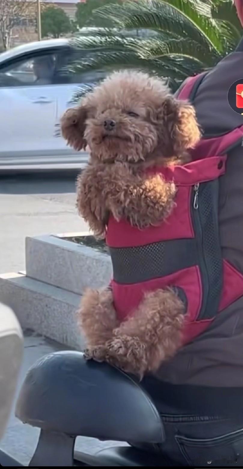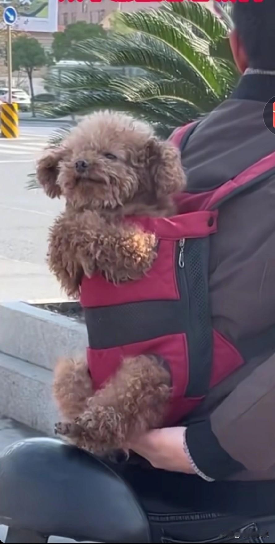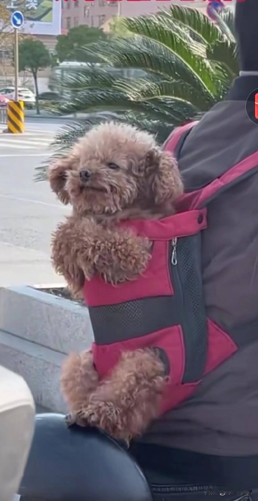 把小泰放在家里实在不放心,出门时简直是将它背在了背上。泰迪本就生性胆小,被背在背上时,前腿蜷缩成拳,抖得瑟瑟发抖。泰迪狗子