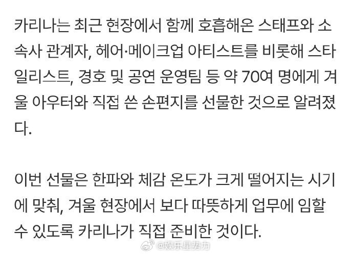 柳智敏给70多名工作人员送外套和手写信 柳智敏的暖心从来不是说说而已💛 韩媒报道她为现场工作人员、经纪团队、化妆造型师、警卫及演出运营团队等 70 多位工作人员,亲手准备了冬季外套和手写信当礼物,把身边每一位工作人员的付出都放在心上。人美心善的 Karina,这份细腻的温柔和真诚真的太戳人了~