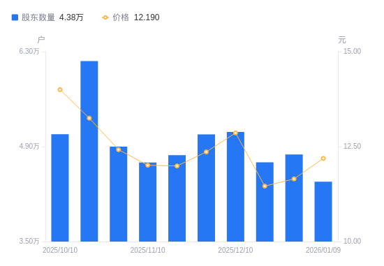 日期A股户数(户)流通A股户均持股数(股)户均持股市值(万元)2026-01-094381728618.1734.892025-12-314784926206.6530.532025-12-194667626865.2430.792025-12-105117124505.3331.512025-11-285081424677.4930.502025-11-204773126271.4431.502025-11-104666626871.0032.272025-10-314900525588.4531.782025-10-206159820357.1926.972025-10-105082624671.6734.54