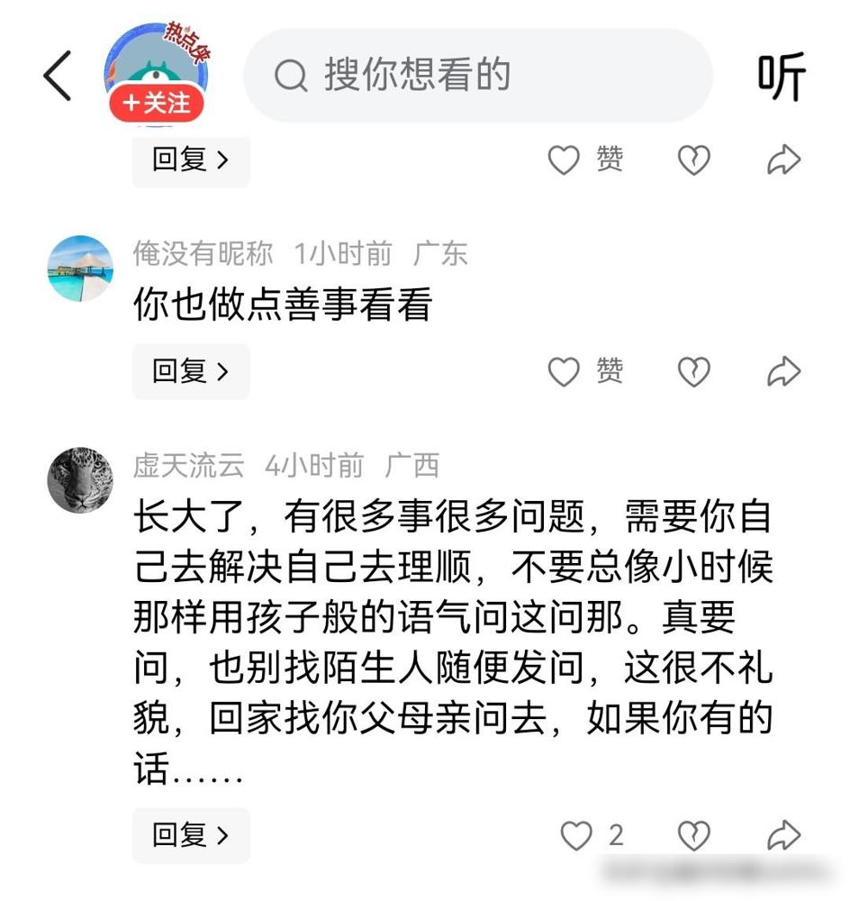 高级的骂人,连半个脏字,都不带的有网友质疑李亚鹏,这医院到底是不是他个人出钱建的,还说他负债累累,拿什么钱来建…… 其实就是有人在李亚鹏那儿不依不饶,觉得他既然身上还背着债,怎么可能还有闲钱去投资建医院,非要问出个子丑寅卯来。 结果李亚鹏还没说话,评论区的一位路人网友倒是先坐不住了,直接甩出一段教科书级别的“劝学式”回怼。 那位网友先是以前辈的口吻,劝质疑者要学会自己解决问题,别总像个小孩一样到处乱问,说这很不礼貌。 我觉得这招真的高,先是在心理上把对方降级成“不懂事的小屁孩”,瞬间就把对方的质问变成了无理取闹。 接着更狠的来了,建议质疑者有问题回家找父母问。 最后补上的那句“如果你有的话”,简直是神来之笔。 这大概就是语言的魅力吧,明明每个字看着都很文雅,但凑在一起却像是一把软刀子,直接把对方的体面给拆穿了。 其实在社交平台上,很多人仗着匿名就理所当然地冒犯别人,这种不带脏字的反击,可能比对骂更让对方难受。 说实话,这种看似优雅实则杀人诛心的回复水平,真不是一般人能写出来的。
