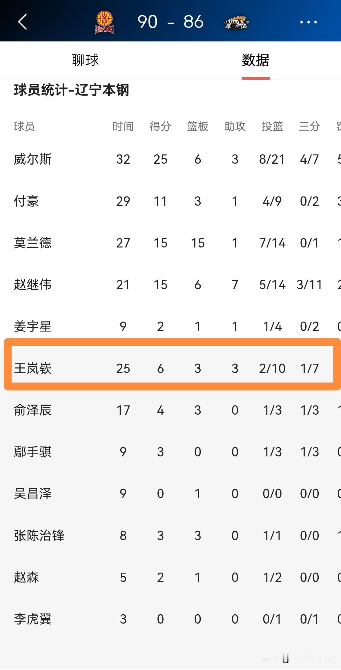 我对辽宁本钢大将王岚嵚真是失望至极!在今天辽宁本钢客场以86:90惜败于山西汾酒的比赛中,王岚嵚的表现简直就是一场大灾难。 整场比赛下来,王岚嵚替补出战25分钟,投篮10中2,其中三分球7中1、罚球2中1极其低效的得到6分,还有4次犯规。 作为辽宁本钢替补阵容的核心,王岚嵚在如此备受关注的一场比赛中打得如此糟糕,真是让人失望透顶。