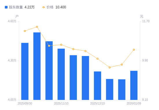 日期A股户数(户)流通A股户均持股数(股)户均持股市值(万元)2025-12-31415748983.338.732025-12-19416028977.288.612025-12-10421718856.168.852025-11-28433558614.308.912025-11-20434158602.408.972025-11-10439188503.879.042025-10-20444778396.998.882025-10-10451598270.189.472025-09-30443578419.719.482025-09-19452358171.079.32