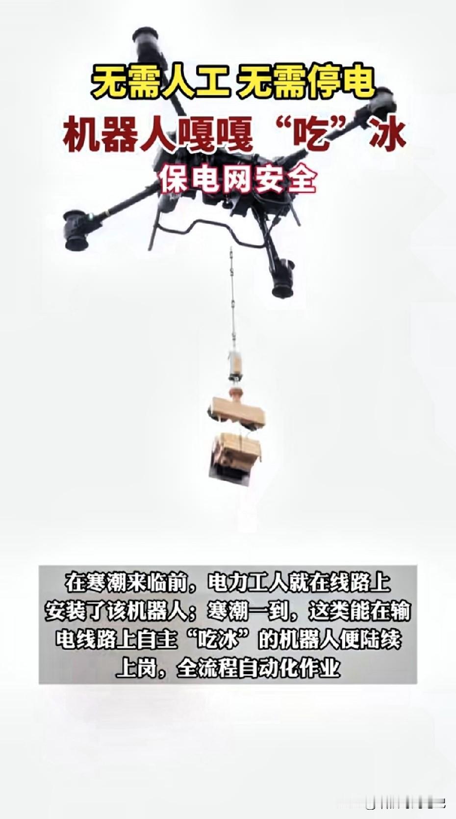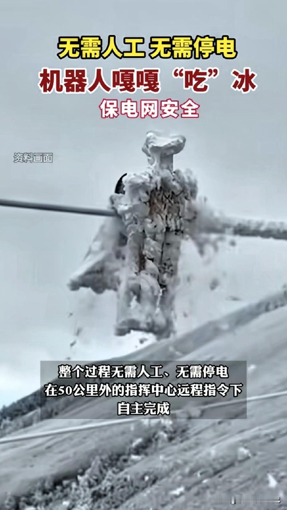 图片里,它像只胖墩墩的“企鹅”,张开“嘴巴”一口咬住电线上的冰棱,发出“嘎嘎”脆响,弹幕齐刷“治愈”。可我觉得,真正该上热搜的,是弹幕背后那行被忽略的小字“220 千伏主动脉,停电 3 分钟,损失负荷 26 万千瓦”。 换算成白话:如果这条线因冰灾断了,你我家里的灯、地铁的闸机、ICU 的呼吸机,全得在呼啸的寒风里裸奔。 冰灾不是“北方专属”,它正在南下。2008 年南方雪灾,贵州、湖南电网垮塌,全国 14 省拉闸限电;2025 年元旦,连“包邮区”杭州西湖都结了 3 厘米厚的冰壳。气候变暖让冷暖空气对冲更剧烈,“湿冷+冻雨”成为新常态。 换句话说,结冰的电线,离我们越来越近。 过去是工人腰挂绝缘绳,拿绝缘杆敲冰,听起来很燃,实则“三高”: 高风险——500 米高空,0℃ 风速 8 米/秒,体感温度 -10℃,失足就是新闻; 高误差——敲轻了冰没掉,敲重了导线直接断裂,2023 年湘中就曾出现“除冰把线敲断”的乌龙; 高成本——一个班组 8 人,一天只能完成 5 公里,人工+停电+发电车备用,花掉 30 万。于是,可爱的机器人“嘎嘎”上线,其实是“被逼的”😆。 它到底怎么“吃冰”?别看动作呆萌,内核是“热刀+夹碎”双模式: 🔻 先喷 60℃ 环保乙二醇,0.5 秒让冰层与导线“脱胶”; 🔻 两片钛合金颚板以 1.2 吨压力夹碎冰块,碎冰直接掉落,不会二次堆积; 🔻机身自重 8 公斤,靠两根绝缘绳自走,越障轮能跨过防震锤、悬垂线夹,全程 4G 图传,地面平板遥控,100 米外喝咖啡就能搞定。 一句话:把“高空高危”变成“地面低危”,把“三小时停电解冰”压缩成“十分钟带电作业”。 但真正的革命,在“数据”。每“吃”一口冰,机器人会同步回传:冰厚、冰重、导线张力、微气象(温湿度、风速)。 过去,国家电网对覆冰的预判靠“观冰站”人工采样,一个省最多 30 个点;现在,机器人一路走一路采,形成“冰灾数字孪生”,算法可以提前 6 小时给出“这条线 95% 概率会过载”,调度中心提前转移负荷,用户侧“零感知”。 从“救灾”到“预灾”,这才是 2025 年能源系统最大的跃迁。 别只当热闹看,它和我们电费有关。按国家电网 2024 年财报,因冰灾导致的“非计划停电”成本是 47 亿元,摊到全国工商业用户,每度电多掏 0.8 分。机器人全面铺开后,目标把冰灾损失降 70%,相当于每度电降 0.5 分,别小看这几厘钱,一座中型工厂一年就能省出 30 万,最终变成“双十一”包裹里的优惠券、你我的地铁票价补贴。 下一步,“嘎嘎”还会去哪?消息灵通人士透露,研发团队正在给机器人加“激光模块”,让它不仅能吃冰,还能“烧”掉风筝、气球、塑料薄膜。这三样占春季异物跳闸 60%。再往后,把“吃冰”模块移植到风机叶片、高铁接触网,整个“大交通+大能源”体系都将拥有一口“好牙”。 ——🤖—— 朋友们,这个冬天❄️,如果你家不再因为“线路覆冰”而突然黑灯,你会不会想起这只“嘎嘎”的小家伙?(图源网络)