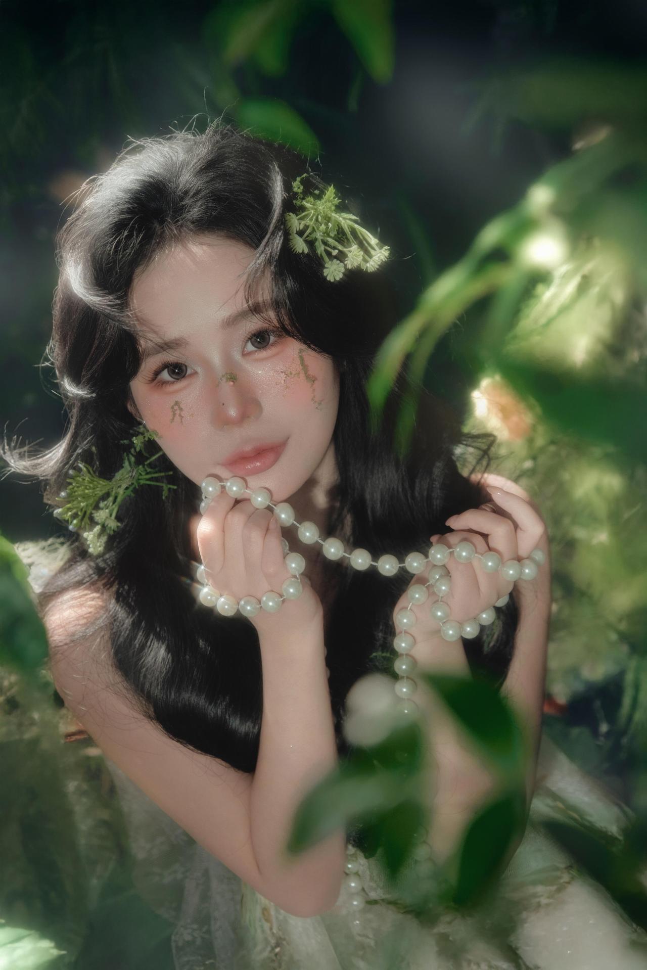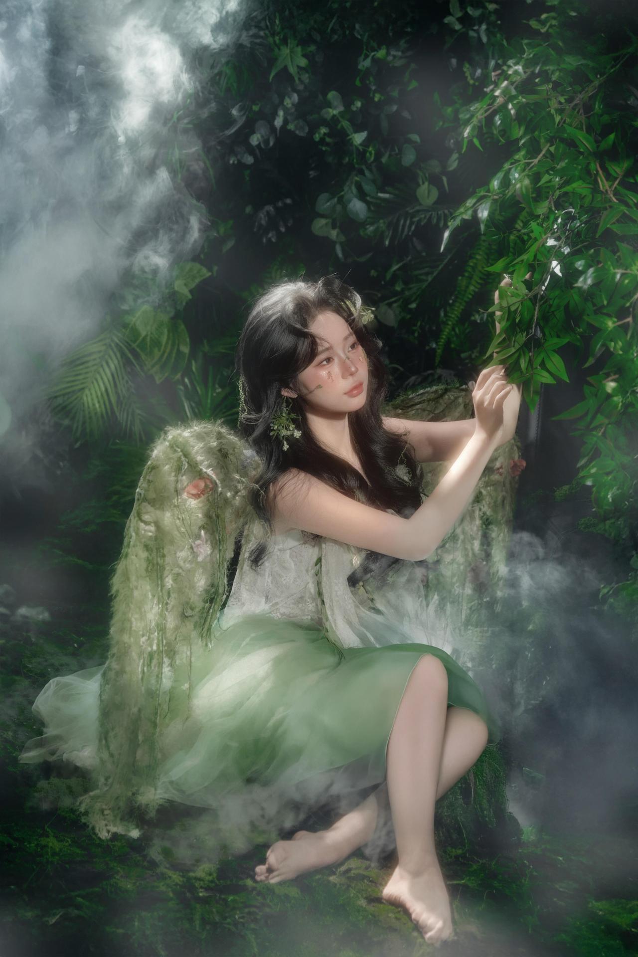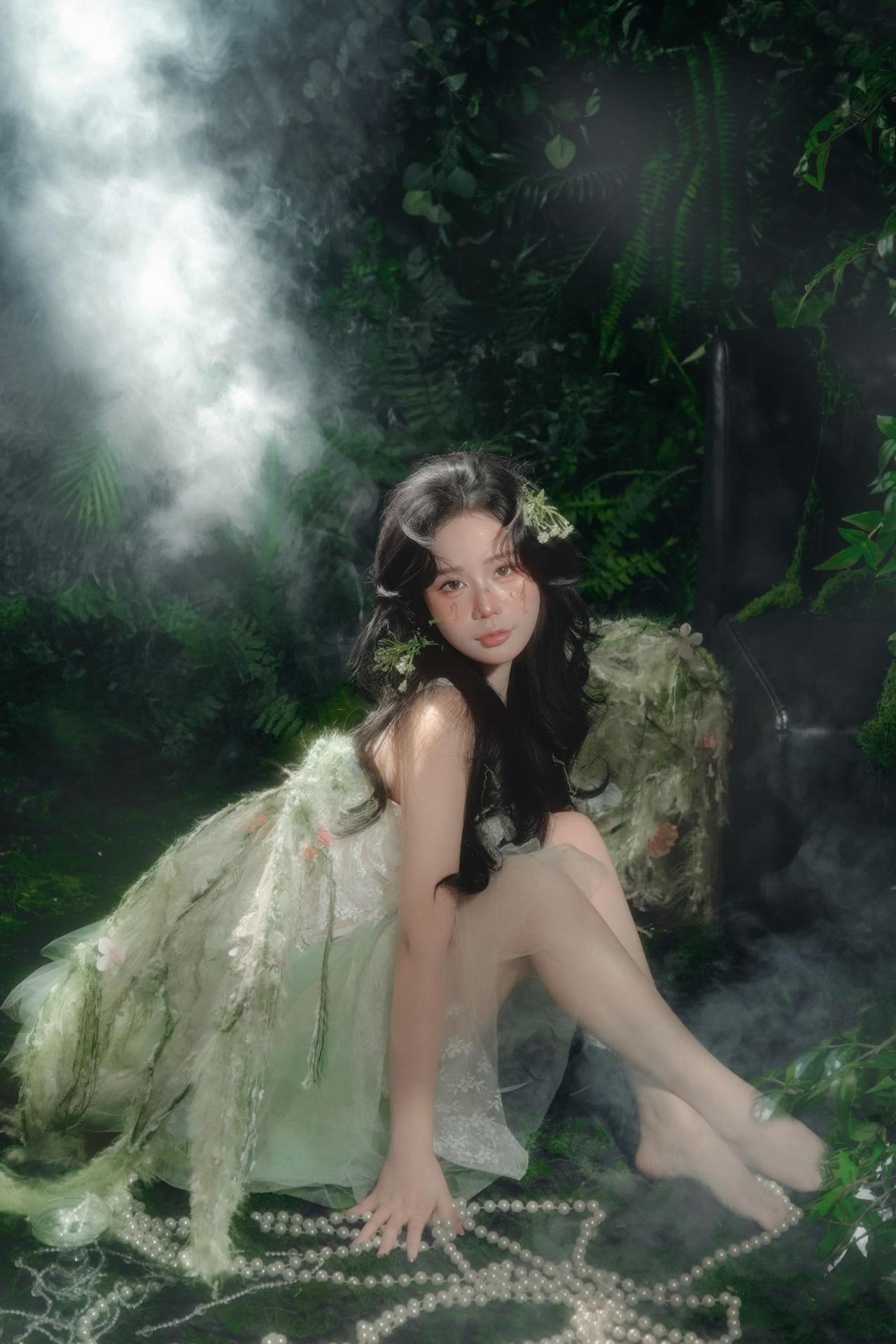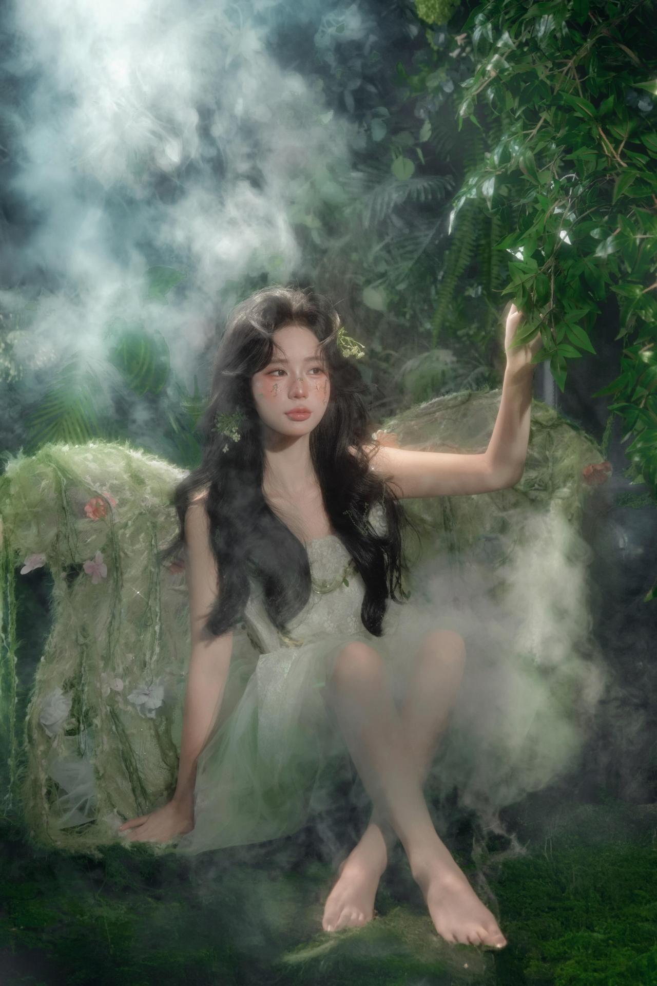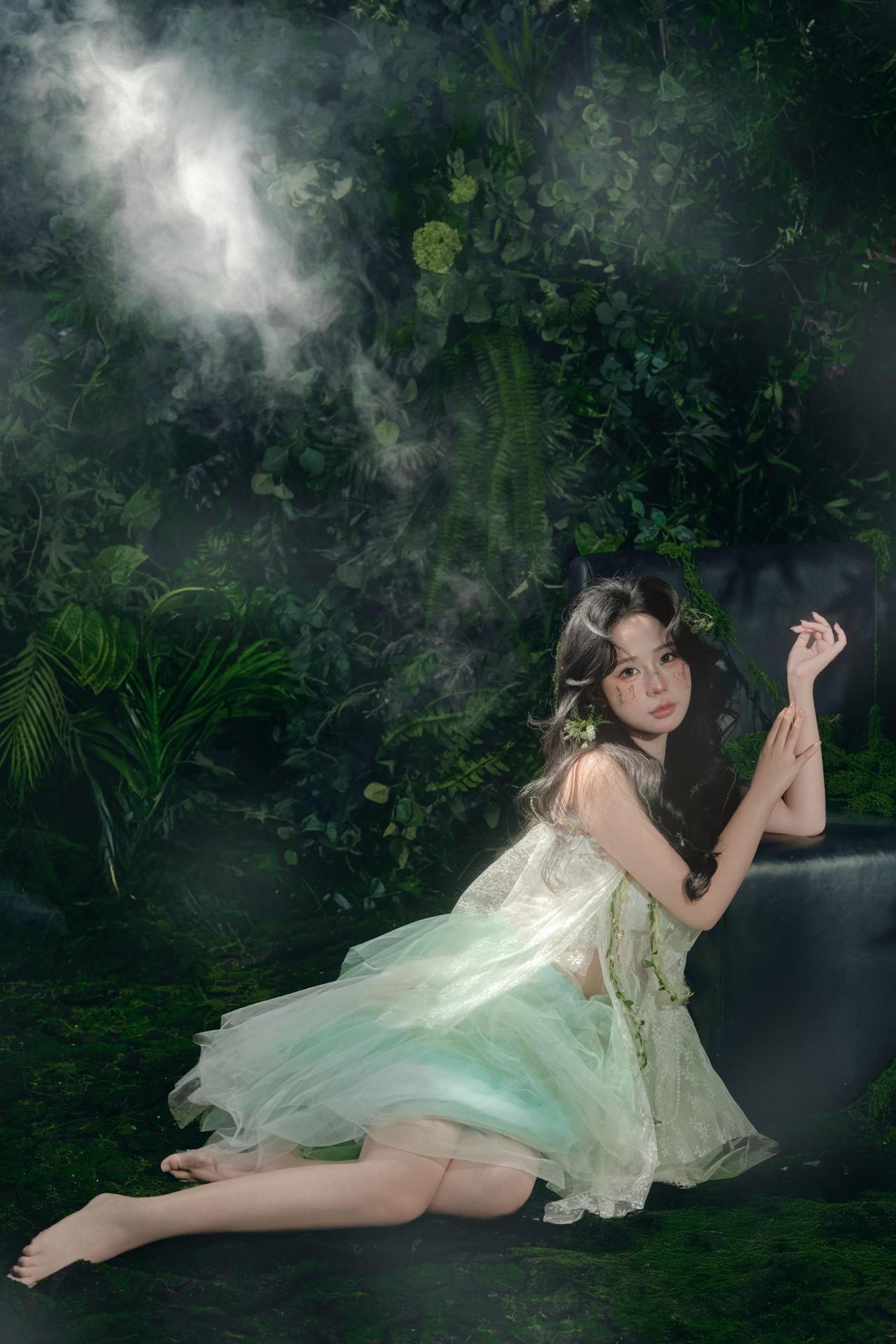 作品以舒展的坐姿与向上的手势,传递出精灵与自然沟通的仪式感。黑色沙发的硬朗线条与人物柔美的姿态形成对比,突出了人物的主体地位。背景的烟雾与茂密绿植交织,营造出朦胧的夜色氛围,弱化了空间的边界感,让画面更具梦幻气质。 绿色薄纱裙装的垂坠感极佳,在光线照射下呈现出轻盈的流动感,与地面的苔藓形成质感对比。妆面的暖调腮红与冷调背景形成色彩对冲,让人物在浓郁的绿色中依然保持视觉焦点。光线运用上,顶部的主光与侧面的辅光配合默契,既保证了面部光线的均匀,又通过明暗对比塑造出人物的立体轮廓。美中不足的是人物手部的珍珠饰品稍显暗淡,若能增加局部补光,珍珠的光泽会更加突出,进一步提升画面的精致度。