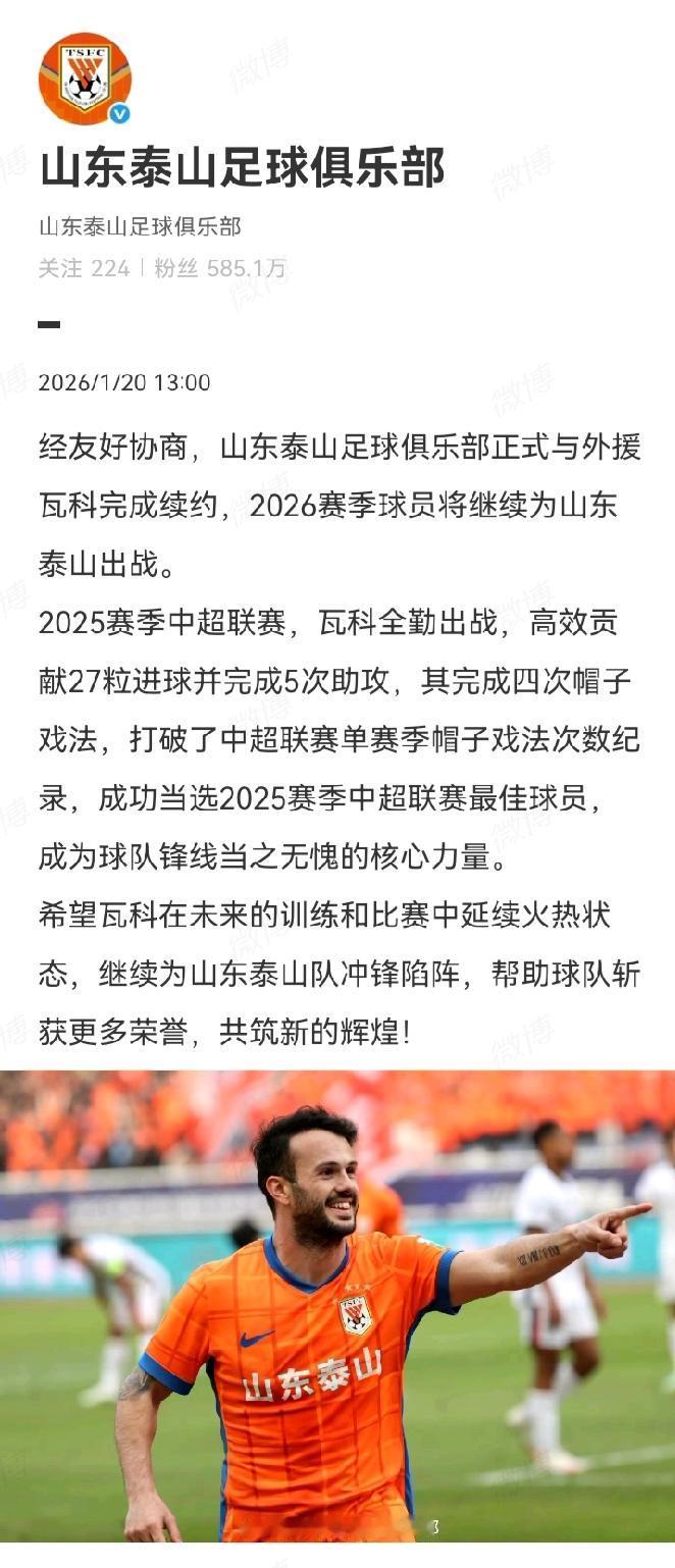 山东泰山俱乐部官宣完成与卡扎伊什维利续约,2026赛季卡扎伊什维利继续为山东泰山出战。卡扎伊什维利的续约,意味着山东泰山前场三叉戟的恐怖攻击线非常稳固。整个球队拼图就差一个外援中后卫,如果能寻得 超级外援,2026赛季山东泰山依旧是冠军的有力争夺者。别看泰山队今年走了几个人,但俱乐部的板凳厚度是非常扎实的,完成更新换代后的泰山会更强!在中超联赛能否夺冠关键还是看哪家俱乐部的外援更强。山东泰山是“矛”很强,现在差的是“盾”,如果能把“盾”的问题解决了,就完美了。 2026赛季冠军的归属还是要看山东泰山、上海申花、北京国安和上海海港的。其它俱乐部暂时不做考虑。新赛季我将继续为山东泰山加油💪💪💪💪💪💪