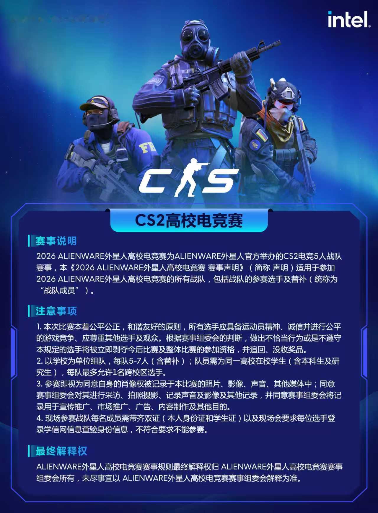 ALIENWARE外星人高校电竞赛|全国报名正式启动】高校电竞的顶级舞台,再度开启。全国五大赛区同步接受报名,1月5日至20日,诚邀所有在校战队集结参战。这是一场纯粹的竞技较量,更是校园玩家实现梦想的赛场。你将与最强的对手交锋,与最默契的队友并肩,在专业的电竞环境中体验纯粹的对决快感。赛事全程搭载ALIENWARE高性能设备,配备英特尔® 酷睿™ Ultra 9 处理器,以强大算力与AI优化能力,确保你的每一帧操作都精准流畅,助你在关键时刻打出制胜表现。现面向全国高校在校生开放组队报名,每队5-7人。冲击千元赛事奖金,争夺全国冠军荣誉,证明你们的团队实力。关注外星人ALIENWARE官方渠道,立即获取报名方式,锁定你的战队席位。这一次,让全国听见你们的名字。我们总决赛见!外星人高校赛 ALIENWARE外星人 高校CS2 英特尔酷睿Ultra
