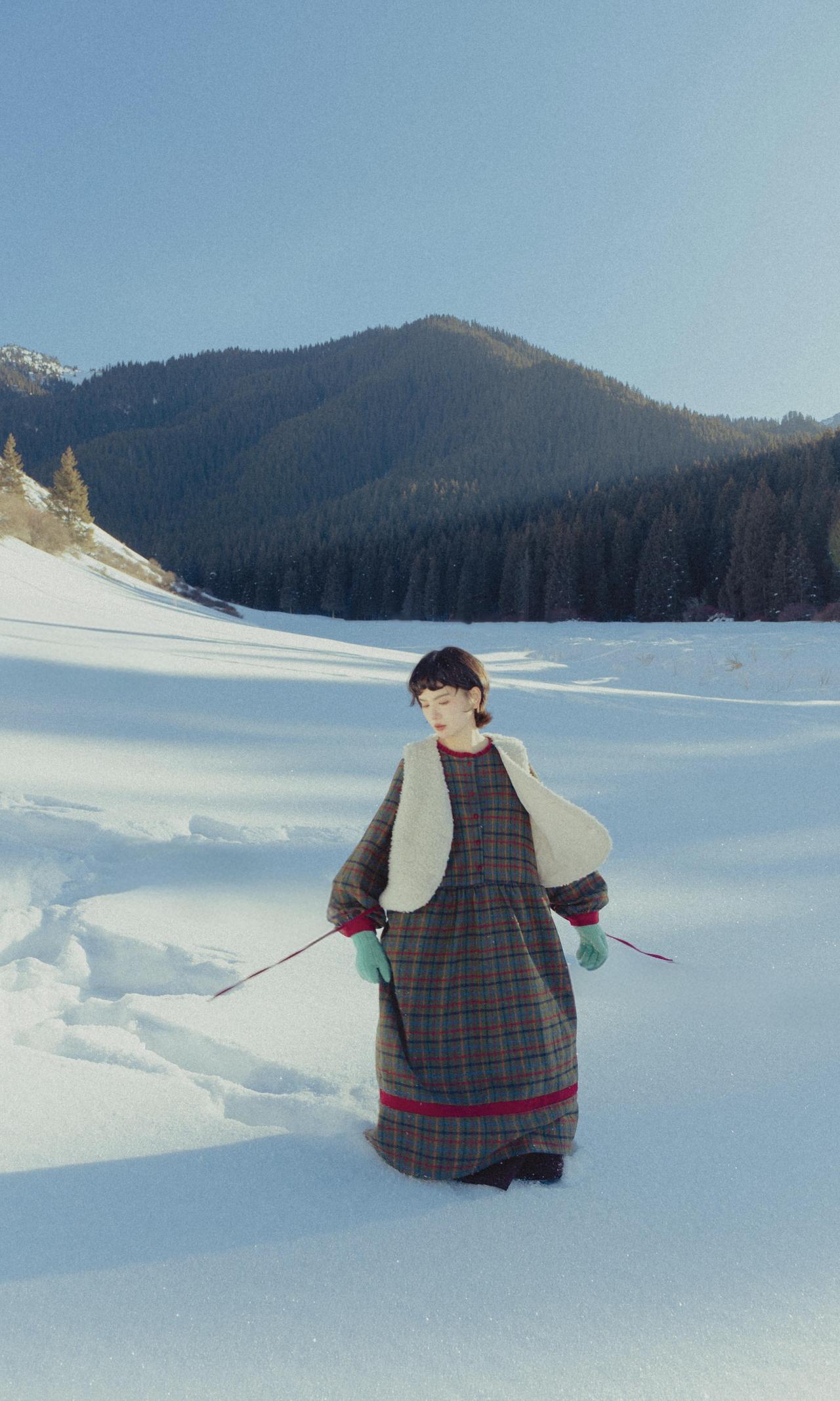 这张作品以动态的雪地互动场景,传递出冬日的鲜活气息。人物躺卧的姿态舒展自然,扬起的雪粒在阳光照射下呈现出细碎的光斑,形成向上的动感线条,打破了雪地的静态平衡。背景的山脉与森林构成层次丰富的远景,深色的山林与白色的雪地形成强烈的色彩对比,强化了空间的纵深感。 服装的搭配极具巧思,格纹长裙与白色马甲的组合既保暖又富有复古质感,绿色手套的点缀则为画面增添了一抹鲜亮的色彩。光线处理上,顶光与侧光的结合让人物面部光线均匀柔和,同时在雪地形成明暗过渡,避免了画面的扁平化。雪粒的动态捕捉尤为出色,高速快门凝固了雪粒飞溅的瞬间,让画面充满生命力。美中不足的是人物面部的表情稍显模糊,若能引导模特在扬雪时保持表情的松弛与生动,画面的情绪感染力会更强。