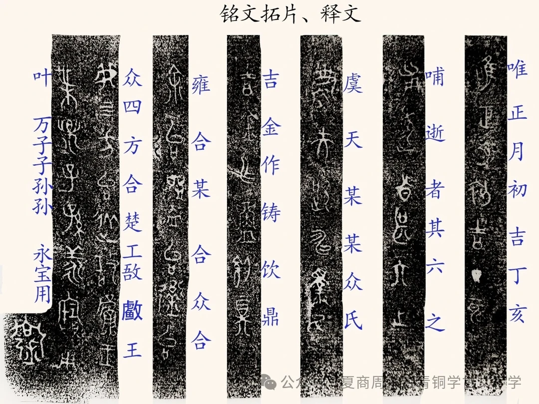 2、铭文释文二:唯正月初吉丁亥,哺逝者其六之,虞夫祭申,择氏吉金作铸饮鼎。雍合、某合,众合 ,众四方合。楚工敔鱼叶万子子孙孙永宝用。