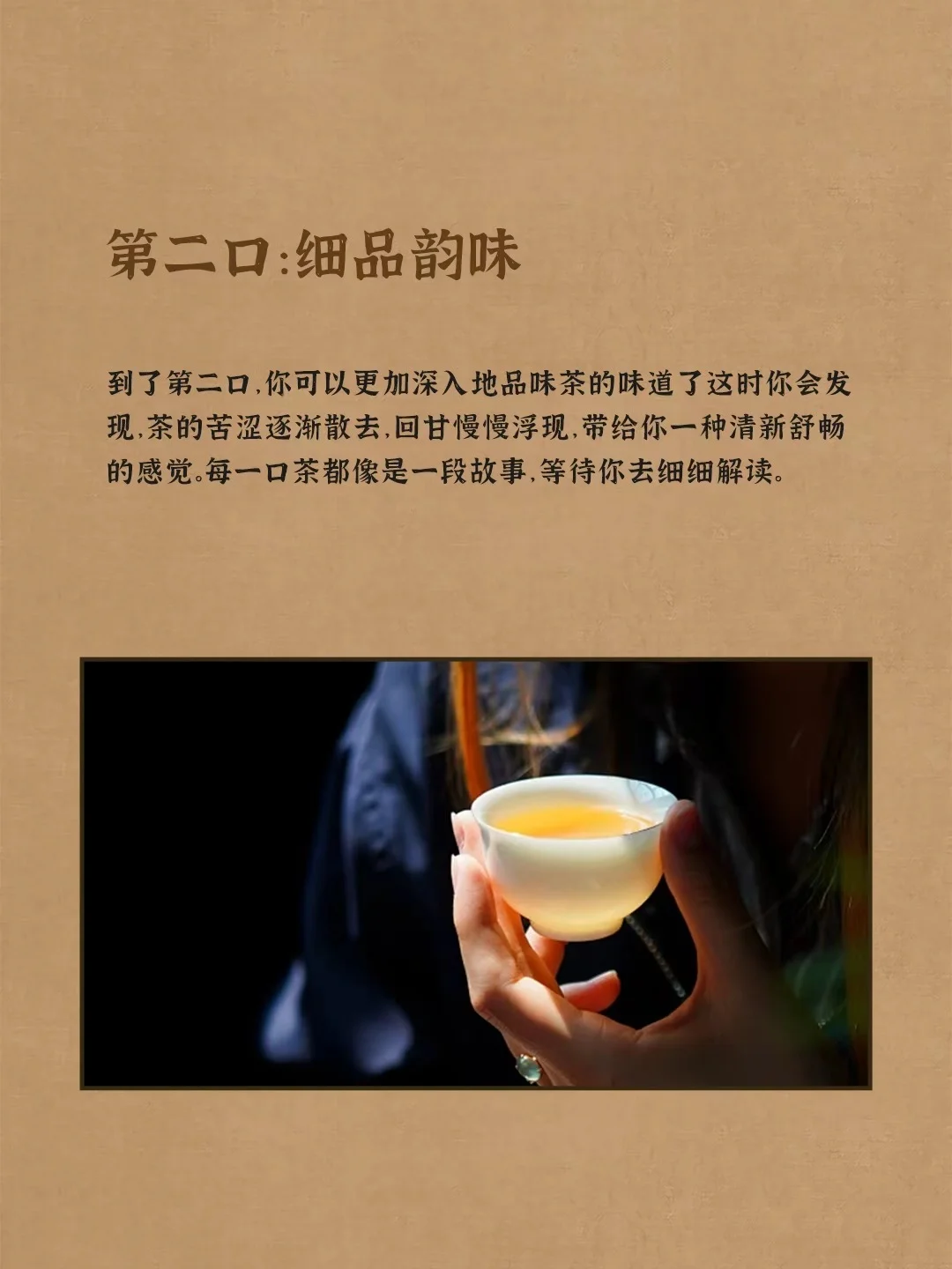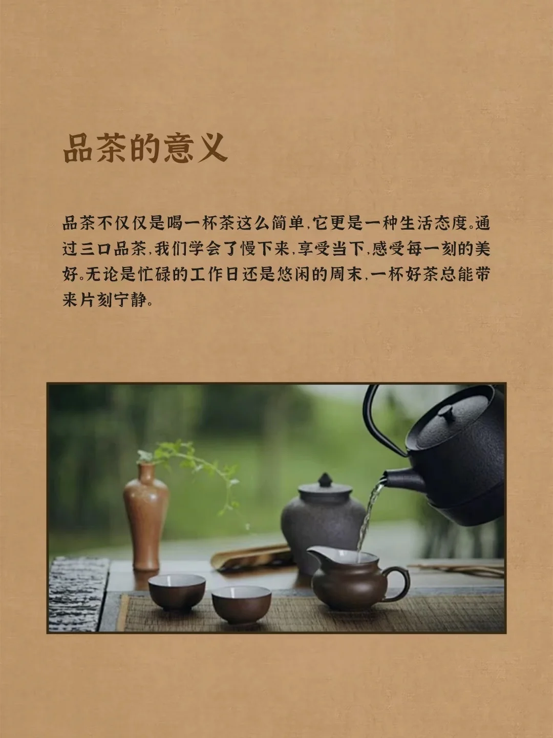 为啥品茶要品三口?门道可深了! 宝喝茶时总听人说品茶要品三口,这可不是故弄玄虚,而是大有讲究! 第一口,轻啜浅尝。微微抿上一小口茶汤,让它在舌尖打转。此时,感受的是茶最直接的味道 第二口,稍作停留。这一口可以适当多喝一点,让茶汤接触口腔各个部位,品味茶的香气层次 第三口,缓缓咽下。体会茶汤滑过喉咙的感觉,感受回甘生津。 品茶三口,从浅尝、品味到回味,如同一场味蕾与心灵的深度对话。不同的茶,三口之间,滋味各异。
