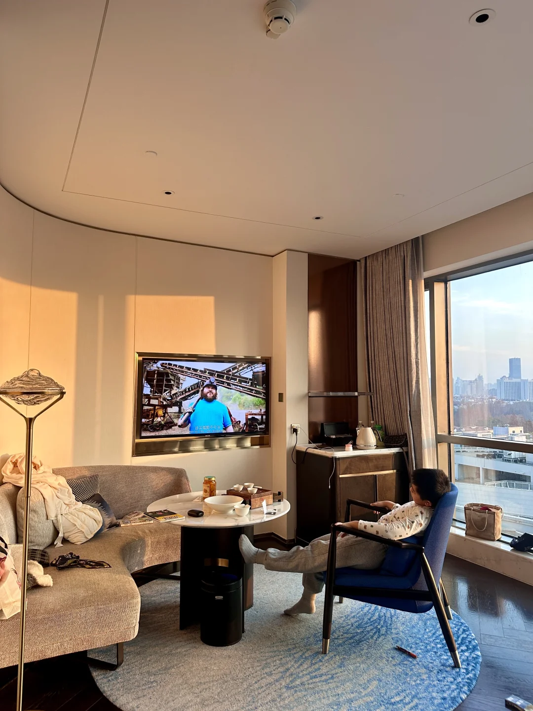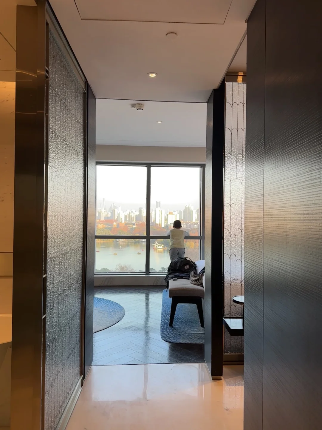 房间布局不是中规中矩,玄关保证了私密性,有独立的衣帽间,整片落地窗,窗外就是长风公园,视野开阔,俯瞰湖景,房间配置和环境视野还是相当不错的。