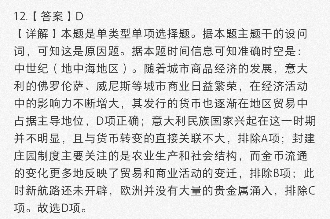 【详解】本题是单类型单项选择题。据本题主题干的设问词,可知这是原因题。据本题时间信息可知准确时空是:中世纪(地中海地区)。随着城市商品经济的发展,意大利的佛罗伦萨、威尼斯等城市商业日益繁荣,在经济活动中的影响力不断增大,其发行的货币也逐渐在地区贸易中占据主导地位,D项正确;意大利民族国家兴起在这一时期并不明显,且与货币转变的直接关联不大,排除A项;封建庄园制度主要关注的是农业生产和社会结构,而金币流通的变化更多地反映了贸易和商业活动的变迁,排除B项;此时新航路还未开辟,欧洲并没有大量的贵金属涌入,排除C项。故选D项。